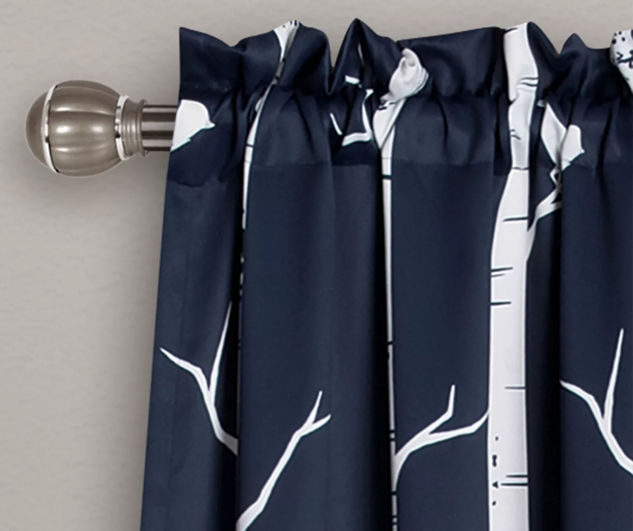 - White branches and birds adorn a solid navy background