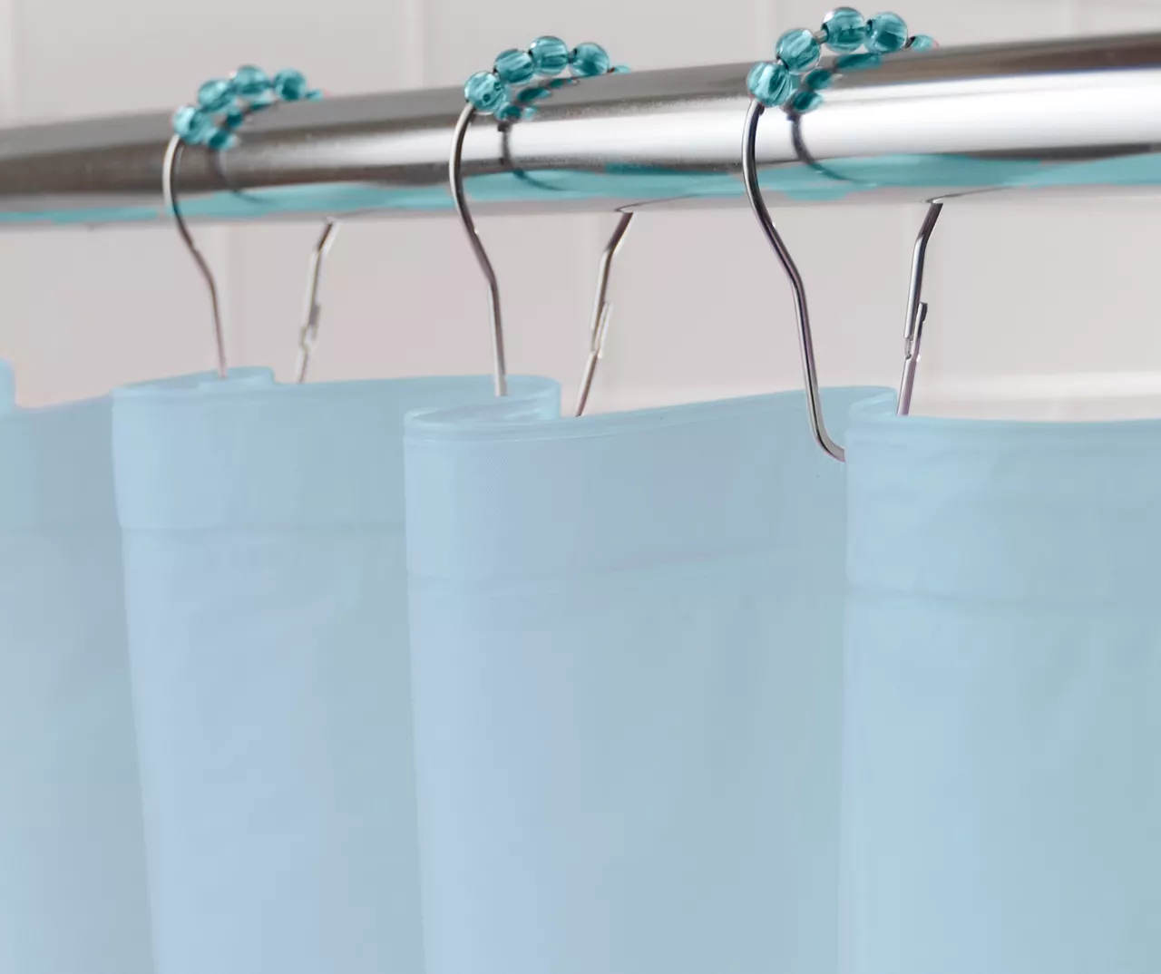 Update the look of your bathroom with this color-coordinated Kenney® liner and roller ring set. The set includes 12 metal shower rings with colored beads that allow the rings to glide effortlessly across your shower rod. Use the matching liner as a stand-alone shower curtain, or layered with a decorative shower curtain. Made of medium-weight PEVA, this liner is PVC-free and odorless. The liner has 12 reinforced holes to prevent tearing.