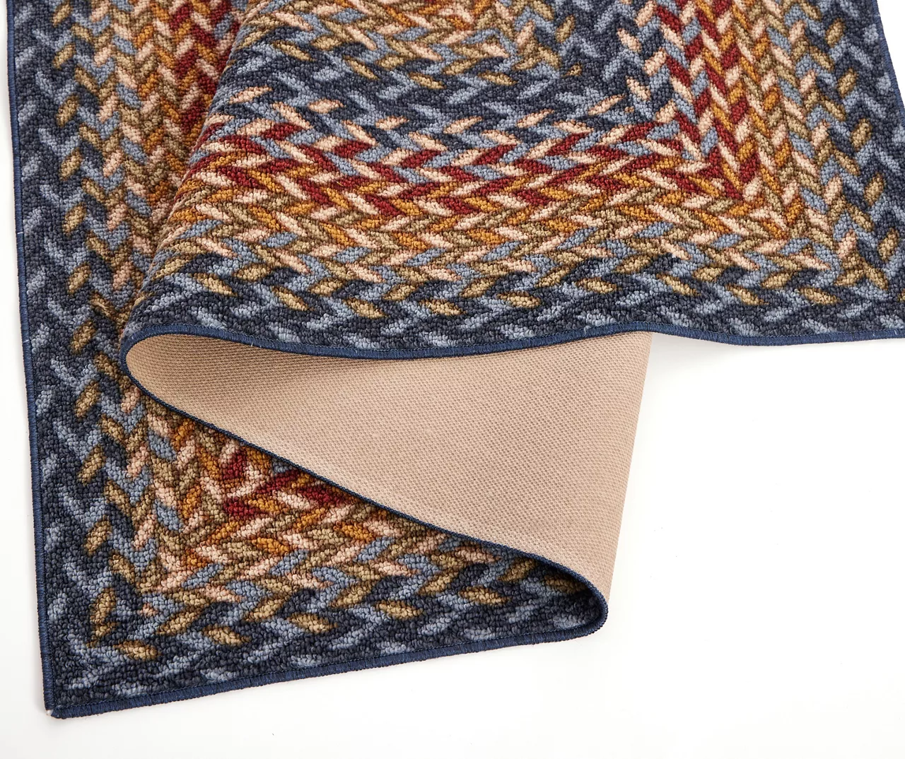 - Printed braid design in shades of blue, yellow and rust red