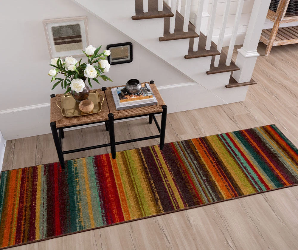 Enjoy a twist on classic stripes thanks to a rainbow of high-contrast colors. Combining a unique pattern and soft comfort underfoot, this rug offers a perfect finishing touch in any living or work space.
