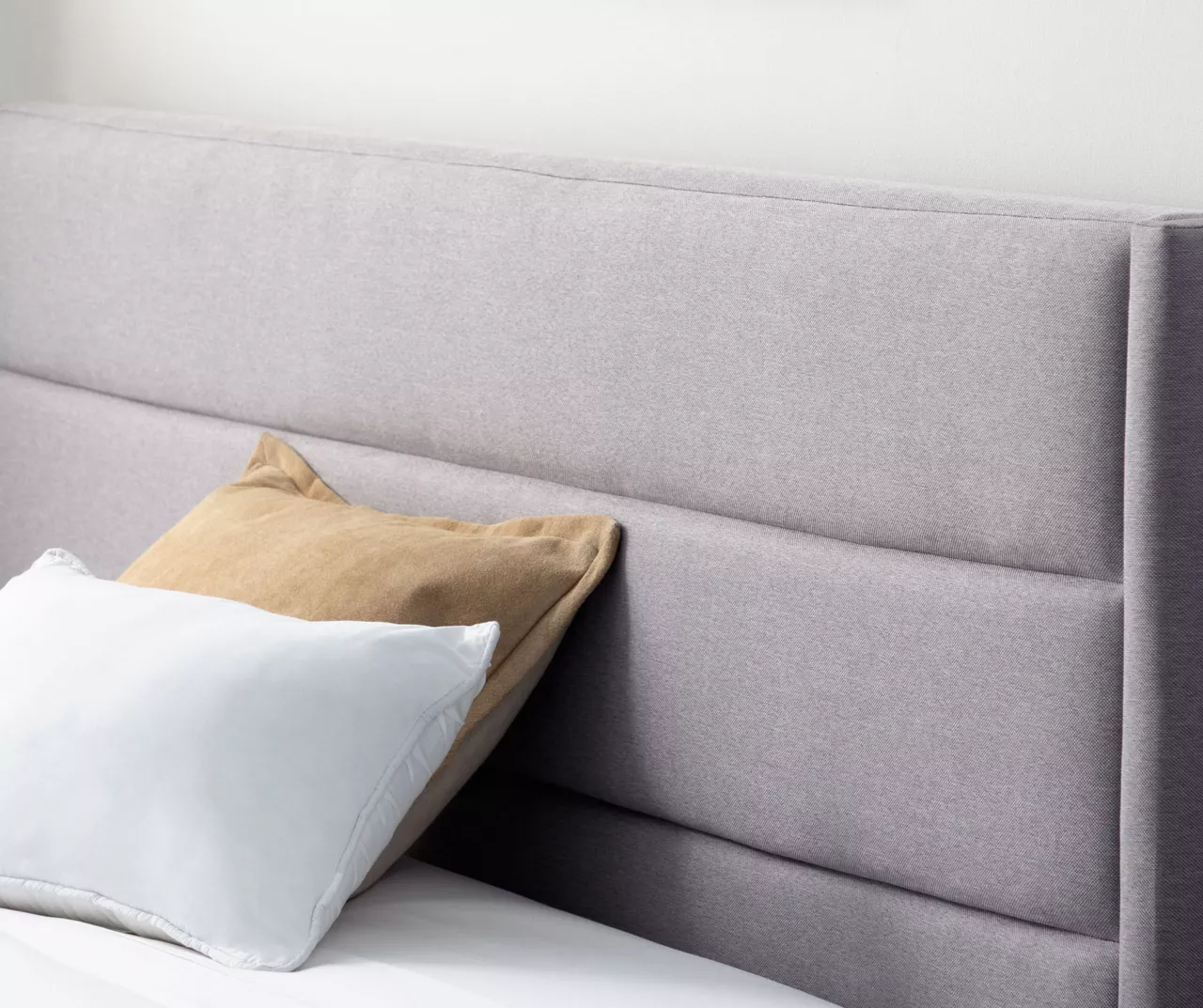 - Modernly chic headboard is finished with horizontal channels and a stone linen-like fabric