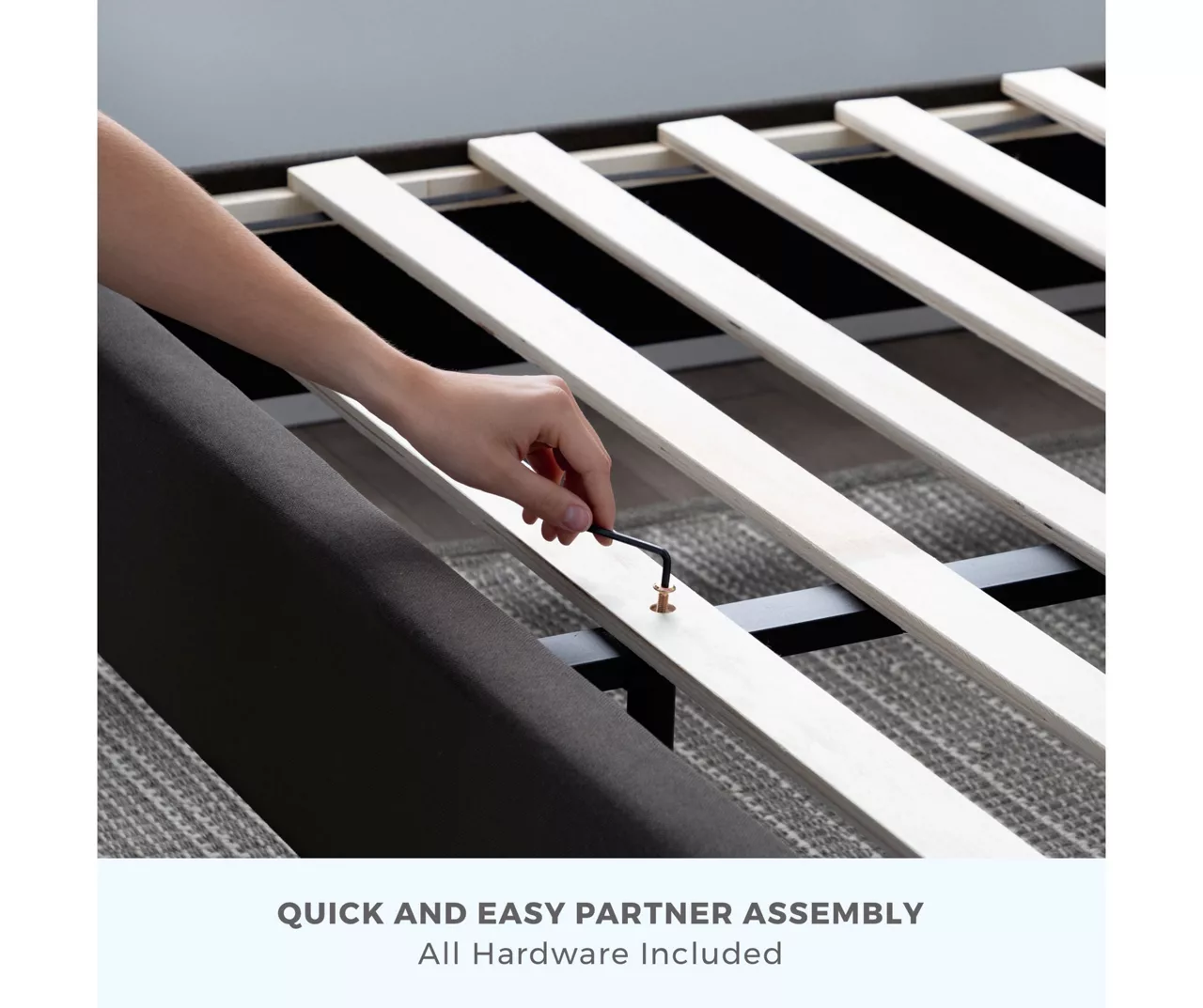 - Includes bed frame, headboard, side and foot rails, legs, 14-piece slat roll and all hardware needed for assembly