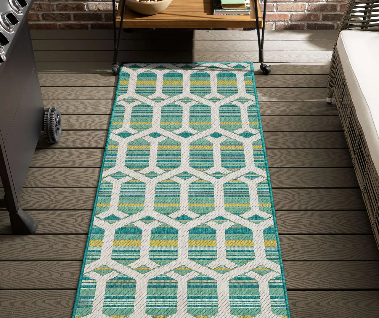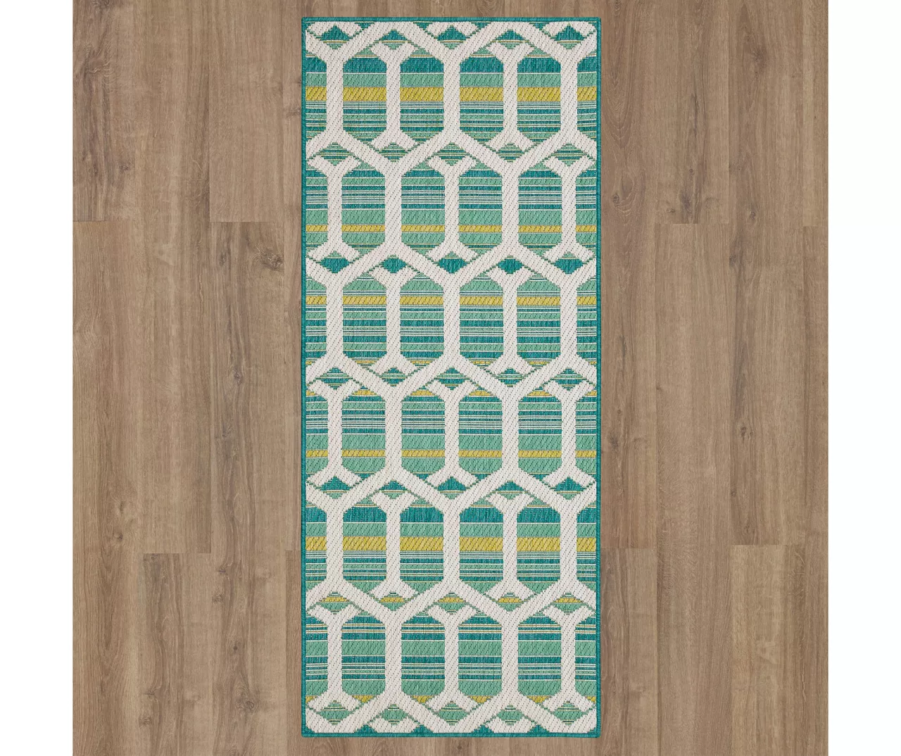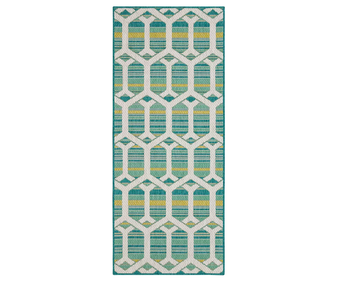 The Mohawk Home Cabana area rug features a geometric design in a soft color palette of teal, green and ivory. Made with all-weather olefin polypropylene yarn, this flatwoven area rug offers a detailed design, soft feel and dependable durability that works in both indoor and outdoor spaces. The resilient surface fibers are resistant to stains, fading and moisture, making it a great choice for high-traffic areas.