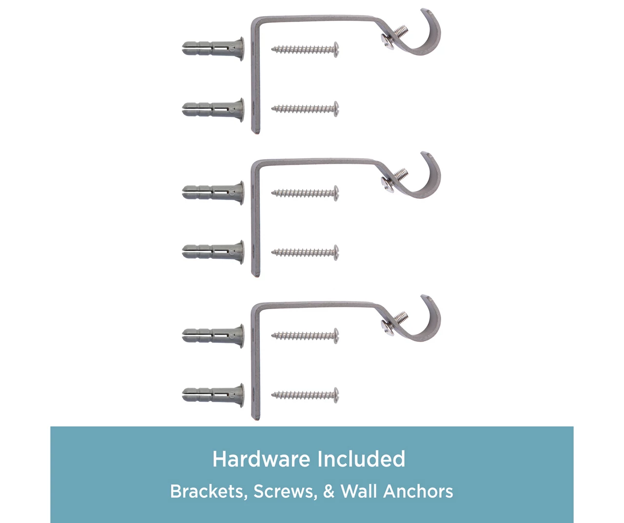 - Includes 1 – telescoping curtain rod with finials, 2 – brackets, 1 – center support, screws and drywall anchors