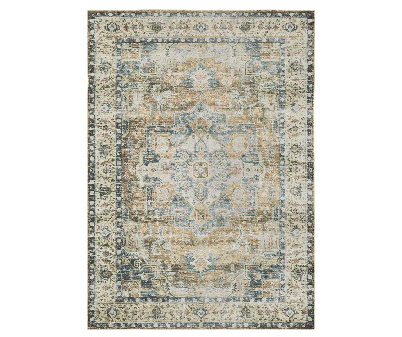 - Traditional, intricate floral medallion design with a distressed look