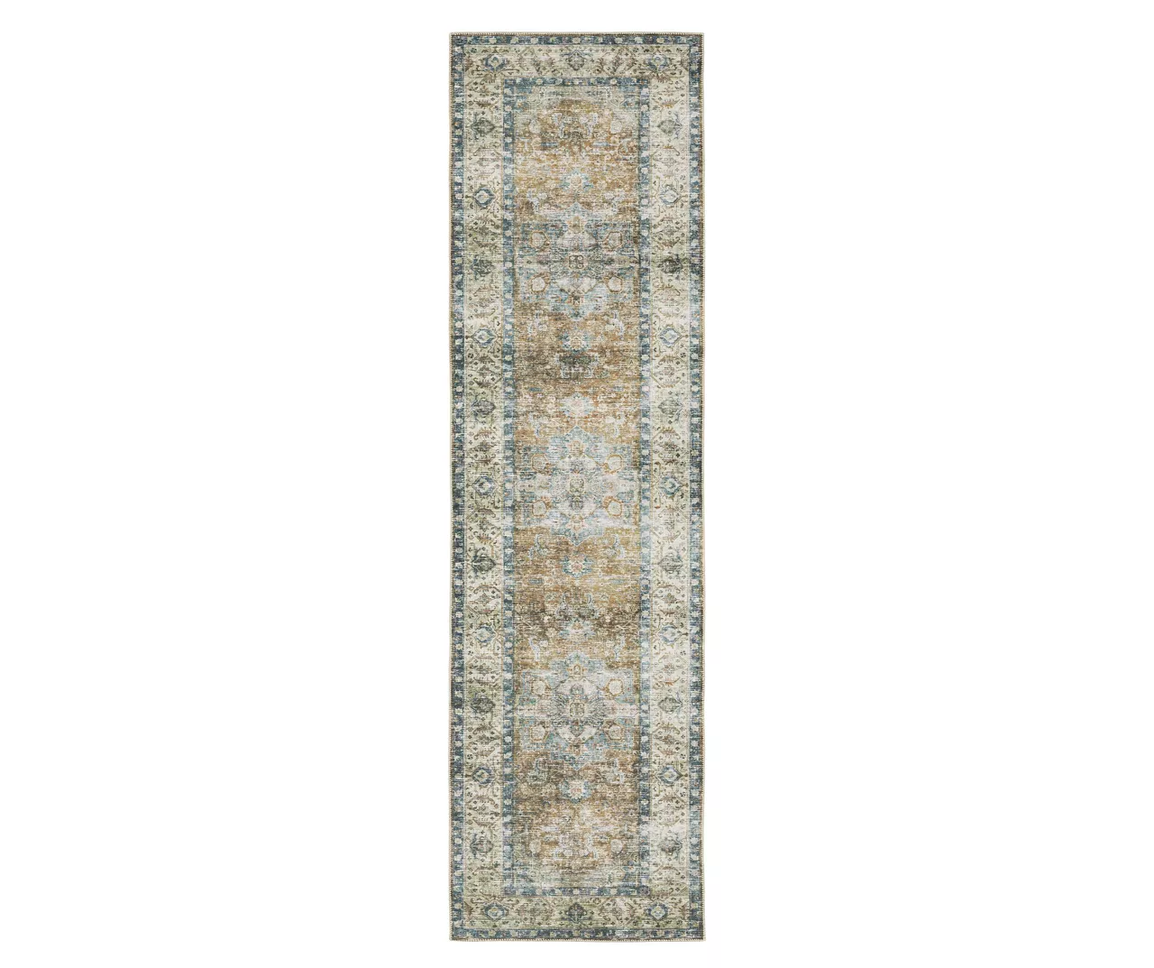 The Cheyenne collection, machine-made from soft polyester, features an innovative printed base with non-slip backing that is perfect for high-traffic areas and family living spaces. With its low pile and intricate blanket stitch finish, this rug showcases a distressed traditional floral medallion design in muted gold, blue and tan hues that accentuates any room in your home.
