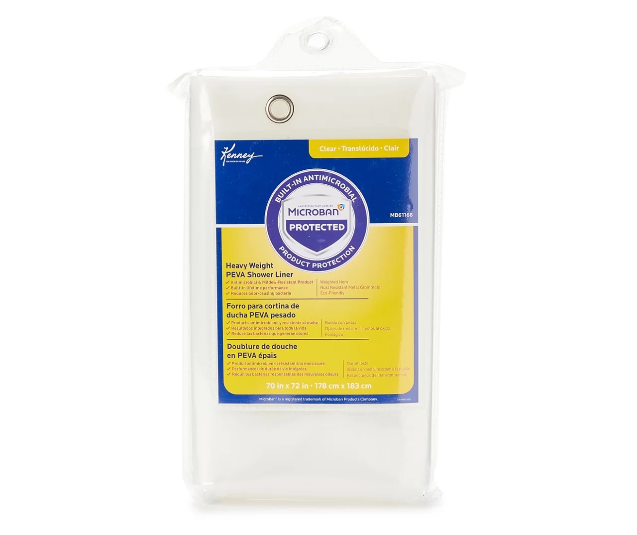 The Kenney® heavyweight PEVA shower liner with Microban® antimicrobial technology inhibits the growth and reproduction of odor-causing bacteria, mold and mildew and provides enhanced product protection from microbes. This shower liner is made to fit most standard tubs and is crafted from sturdy PEVA topped by 12 rust-resistant metal grommets. A weighted hem helps keep the liner in place and reduces billowing.