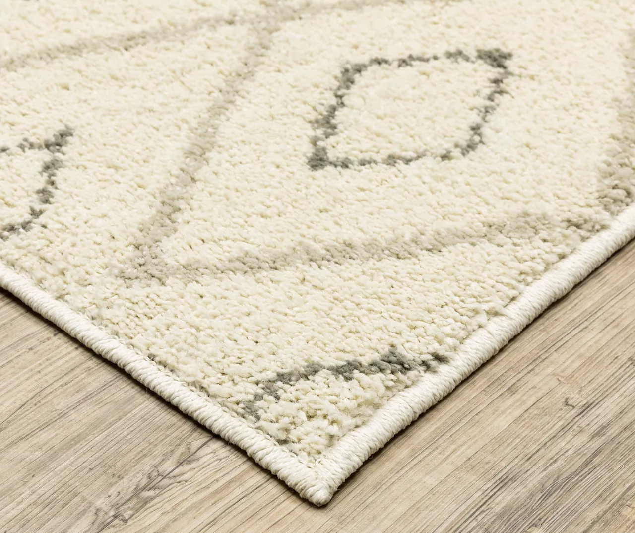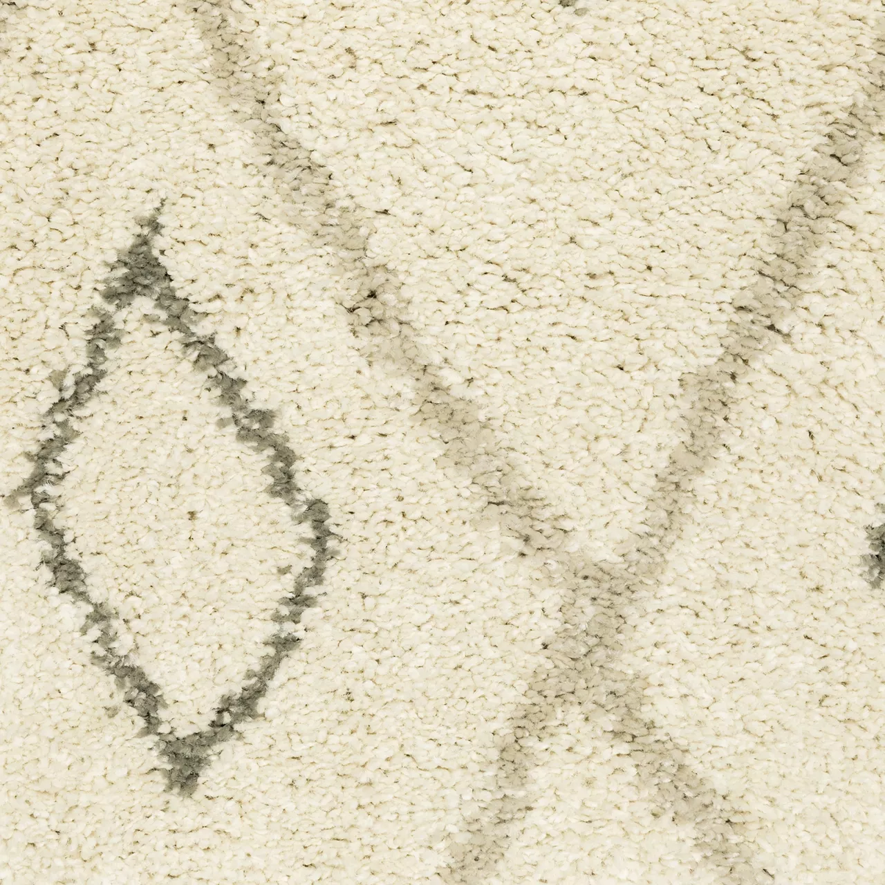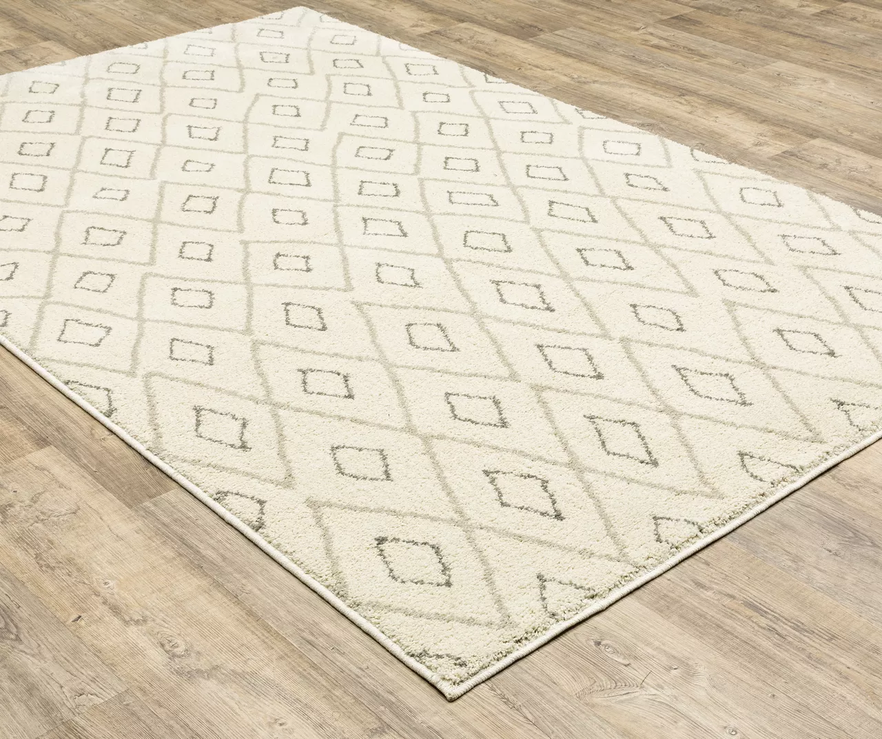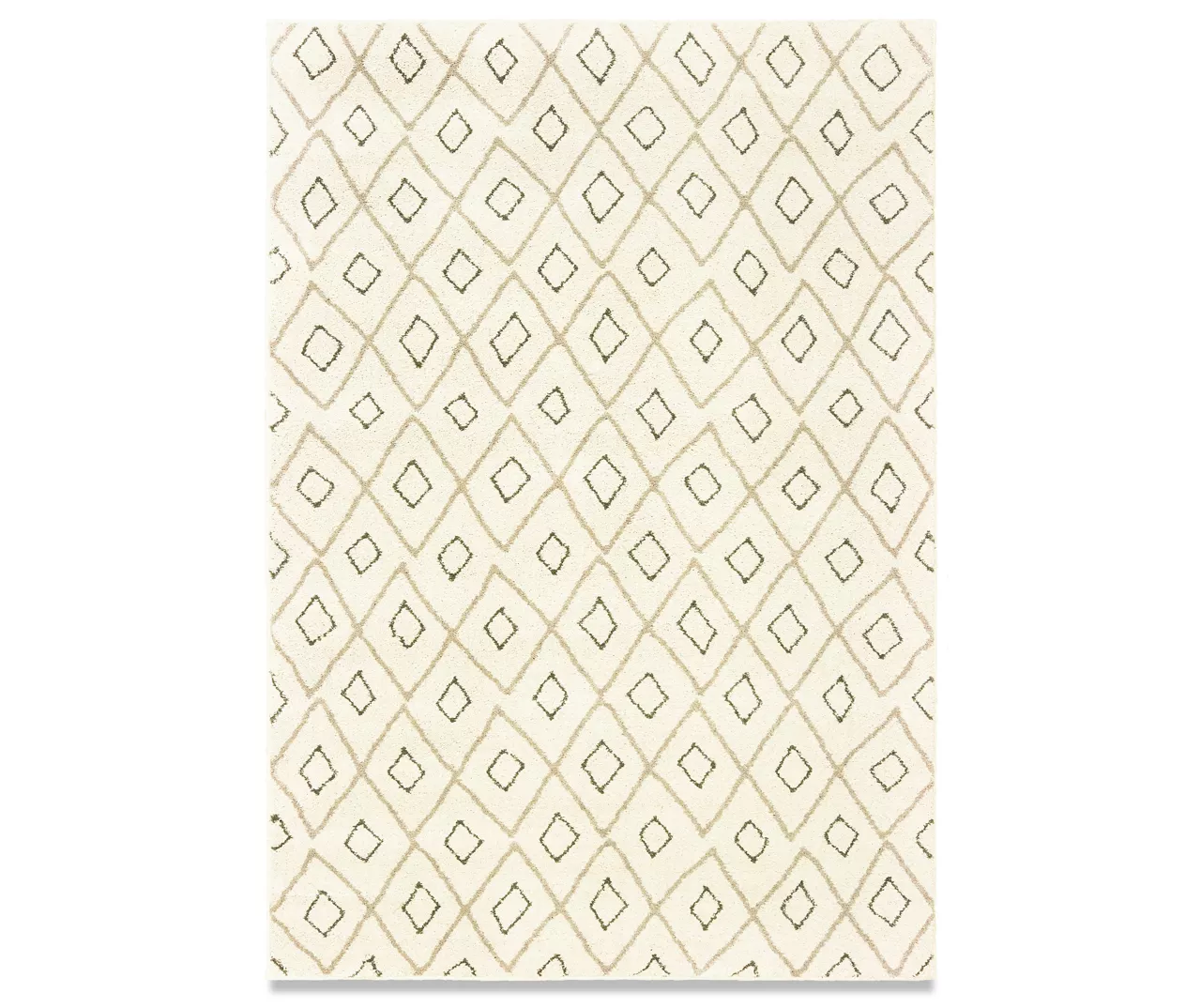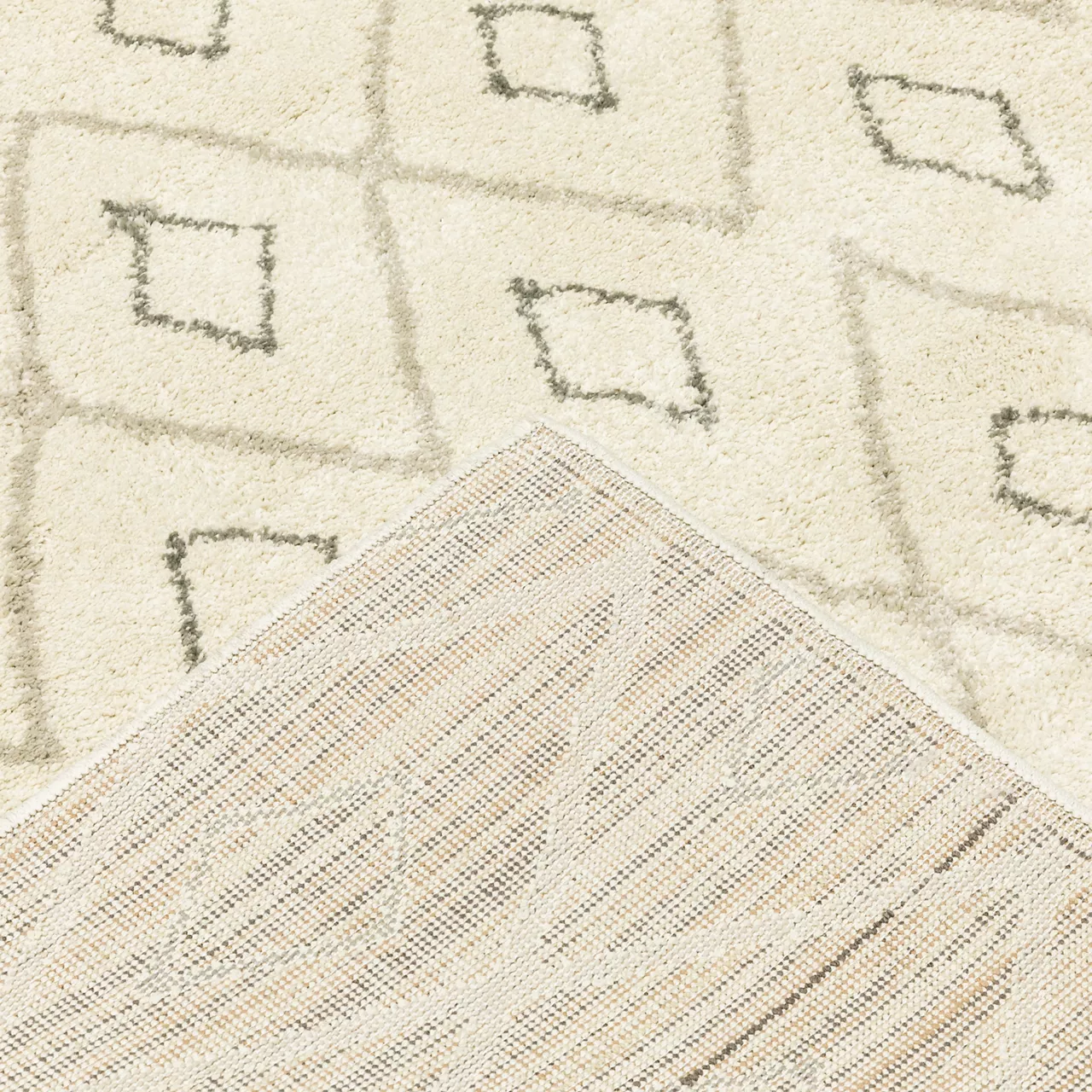 This rug is highlighted by a sleek aesthetic that combines neutral colors and a modern diamond pattern for a livable look. Machine-woven of polypropylene, it boasts a soft, textured yarn in a high pile for a plush feel underfoot. The muted colors make for an easy design color palette.