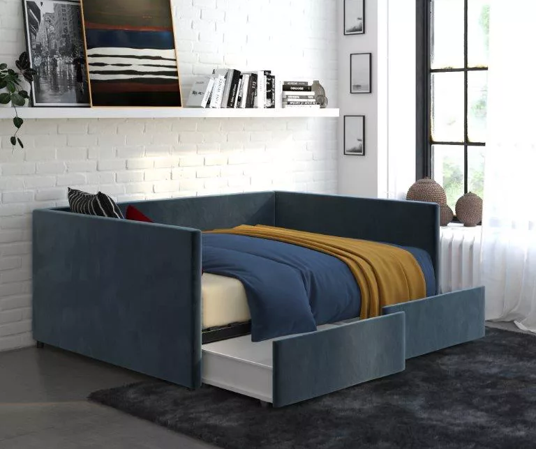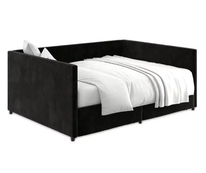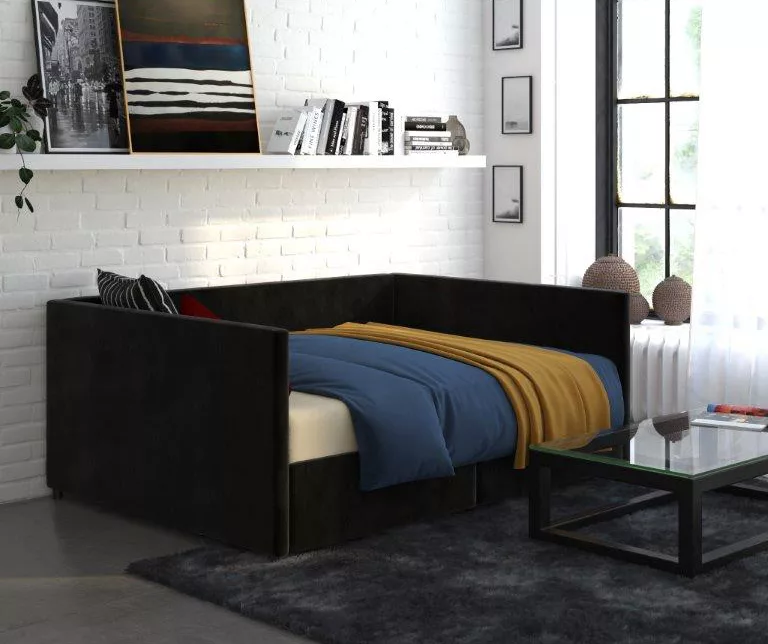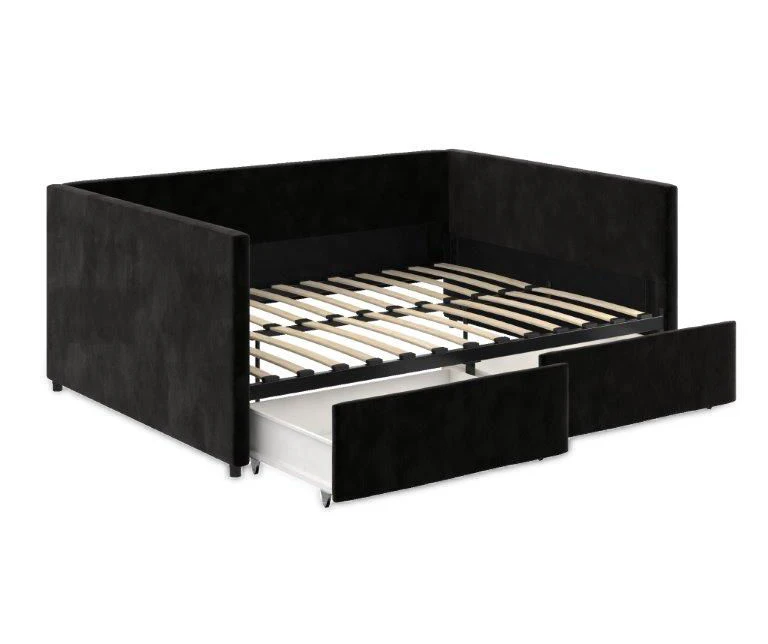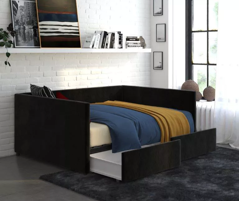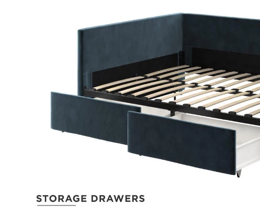 Make a bold statement with the DHP Tallie urban daybed with storage. This multifunctional furniture piece is defined by a boxy, clean-lined silhouette that promises to accentuate the look of your room. Made with a robust wooden frame, this daybed has a wood slat base that helps air circulate better. What’s more, it provides superior comfort without the need of a foundation and accommodates a standard sized mattress. Perfect for small living spaces, the Tallie daybed comes with two convenient drawers on casters that are useful to store personal belongings like extra bedding, accessories and more.