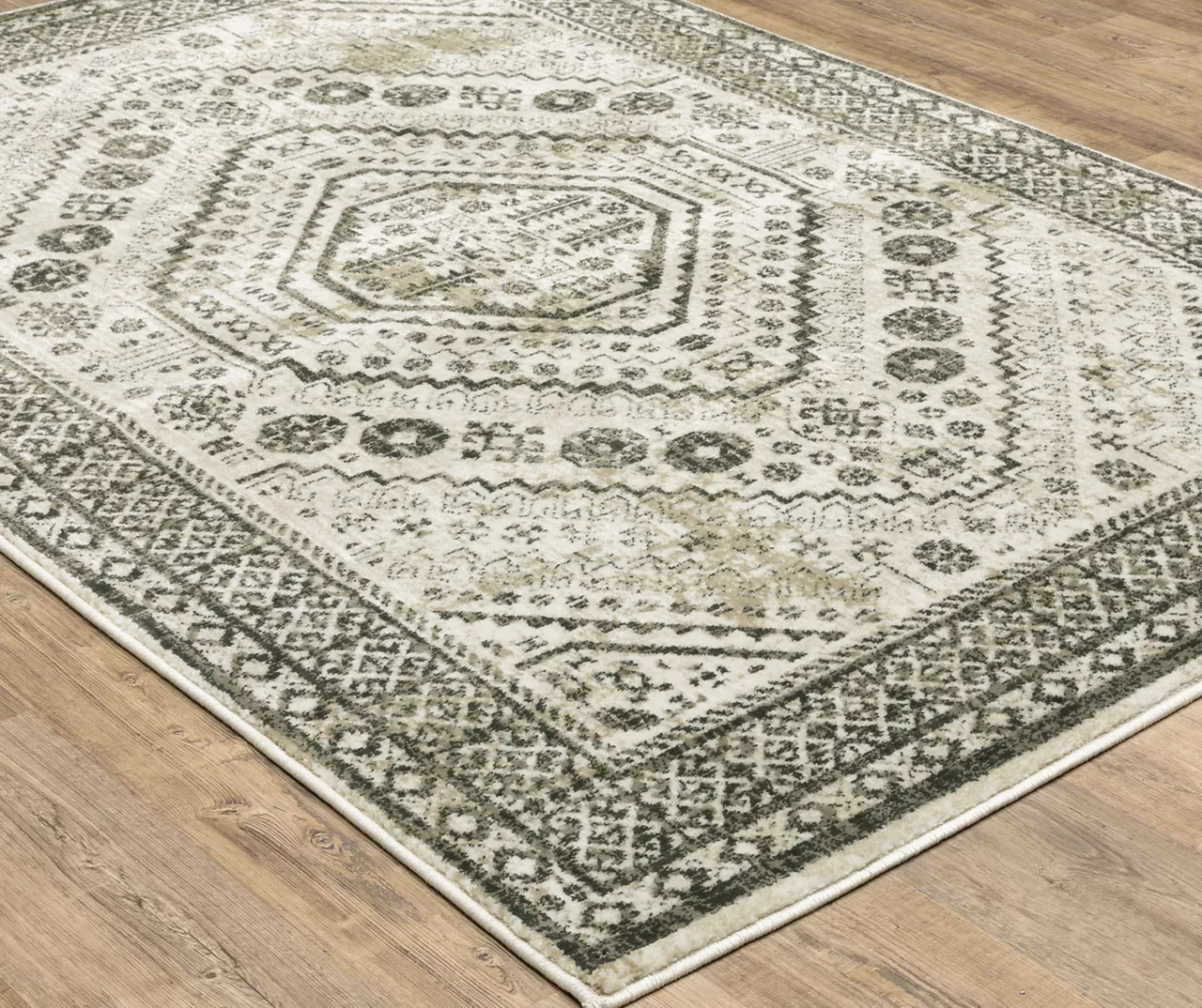 The Geby collection is a power-loomed area rug that flaunts a geometric design inspired by American Southwest aesthetics. Dark gray mingles with shades of ivory and beige for a floor spread that effortlessly and elegantly complements your style.