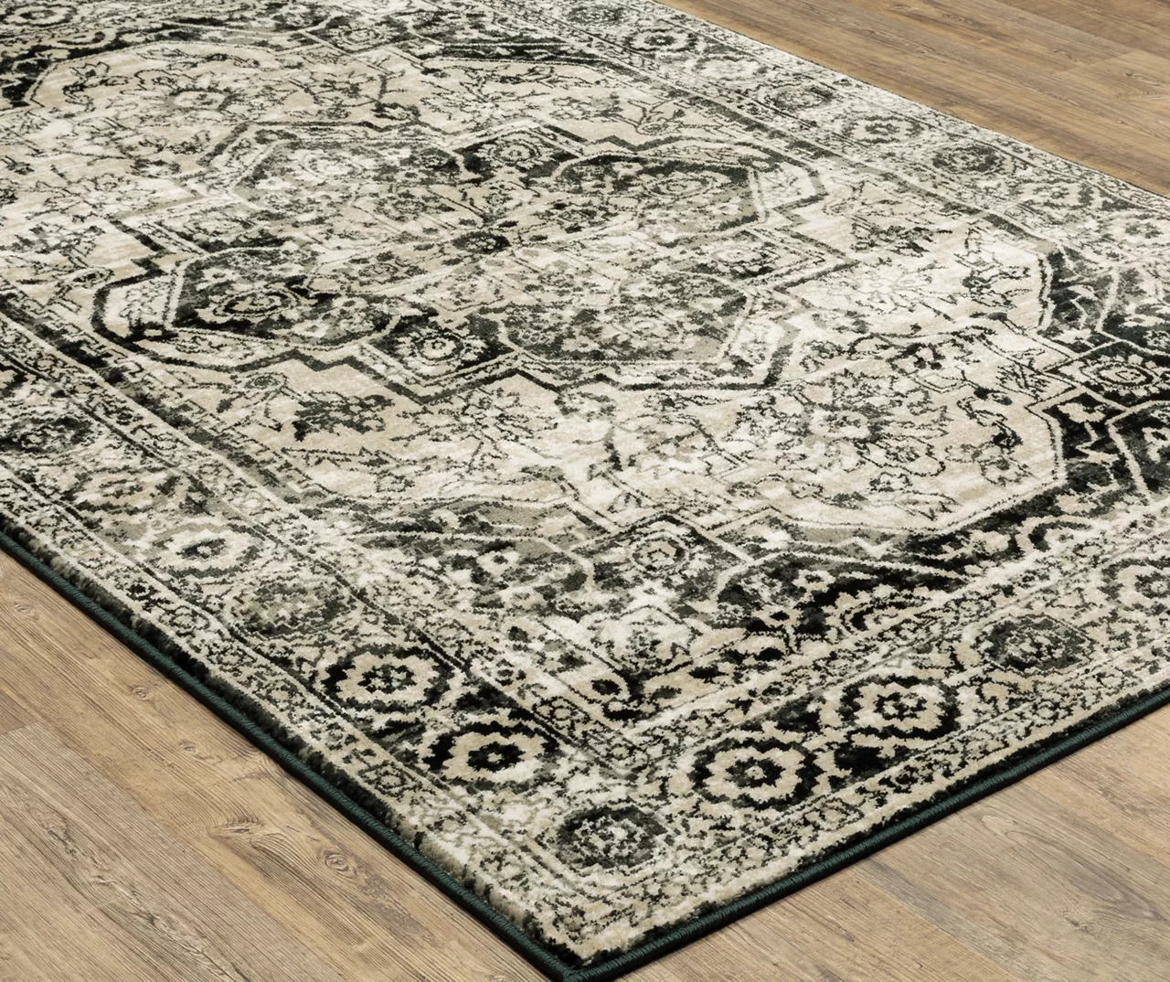 The George collection is a power-loomed area rug that flaunts a traditional floral medallion design. High-contrast black and beige mingle with shades of gray, touches of ivory and warm taupe for a floor spread that effortlessly and elegantly complements your style.
