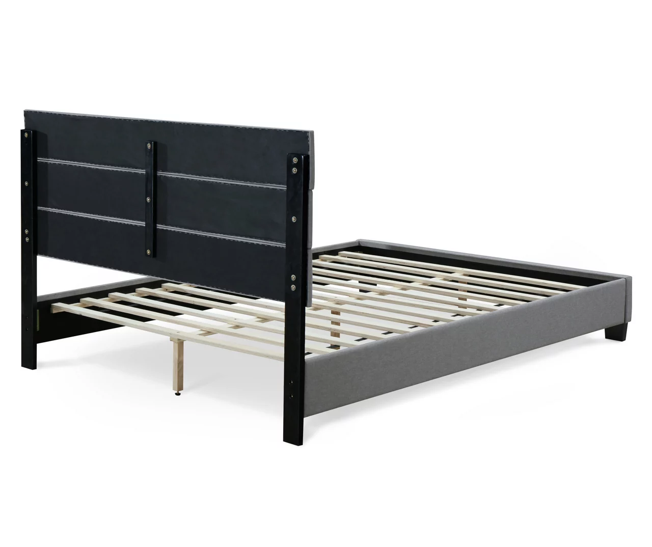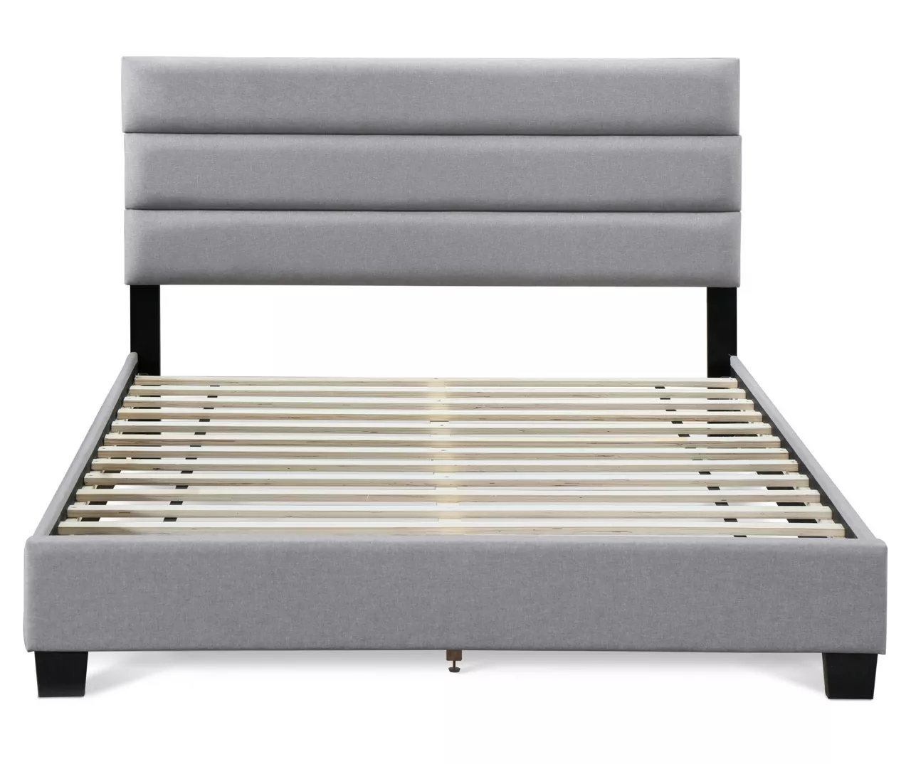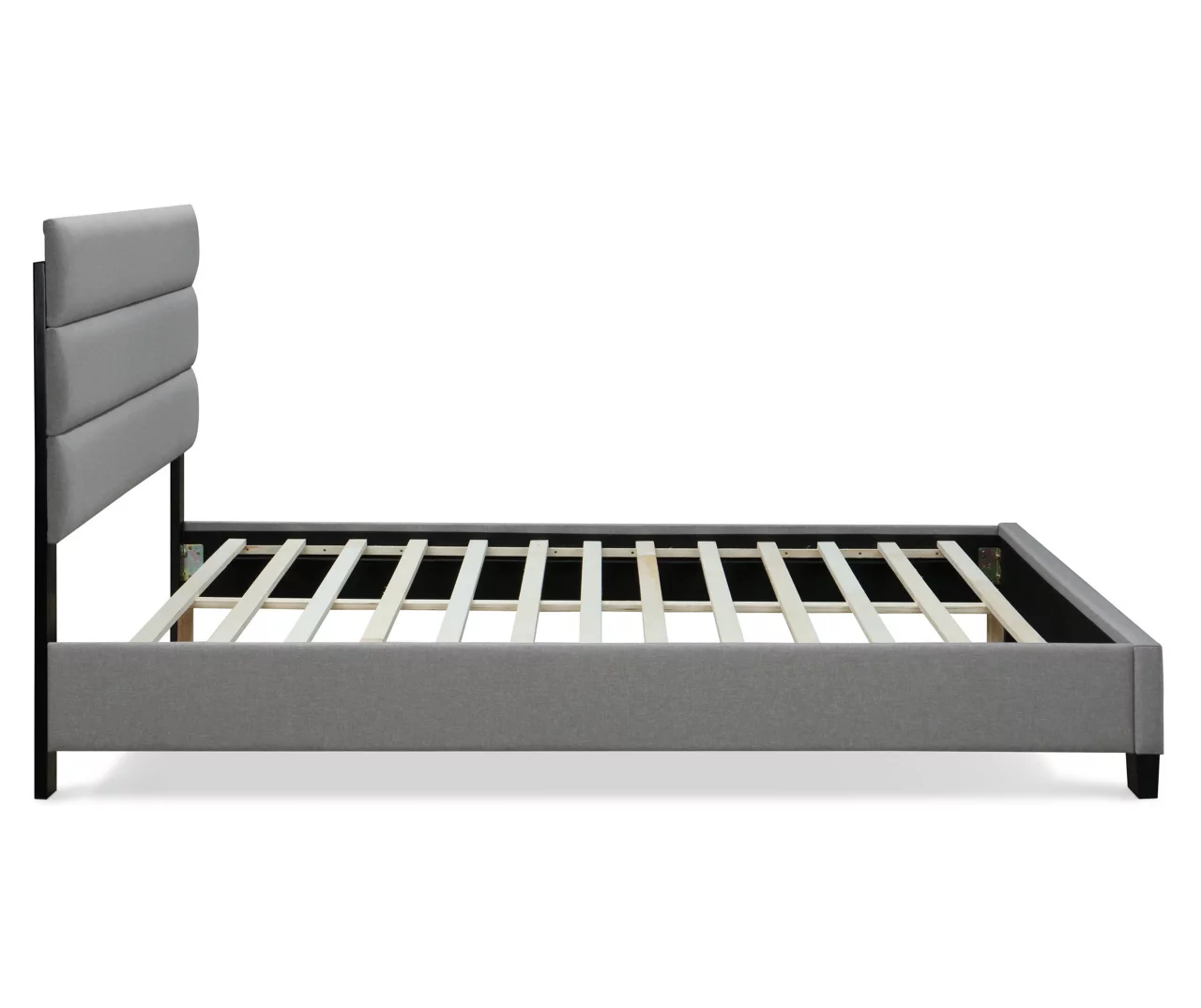 - Gray queen bed frame upholstered in linen-like fabric