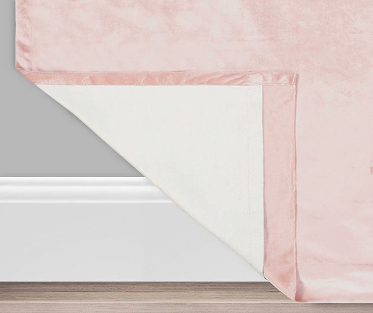 Find the perfect combination of fashion and function with the Eclipse Harper window curtain. This beautiful panel offers Absolute Zero 100% blackout benefits with a premium thermal lining that gives a rich handfeel and provides luxurious drapability. It features solid velvet fabric in blush, which makes it versatile and perfect for the bedroom, living room, dining room or office and allows you to enjoy all of the light-blocking, noise-reducing and energy-saving benefits. Reverse of panel is light gray.