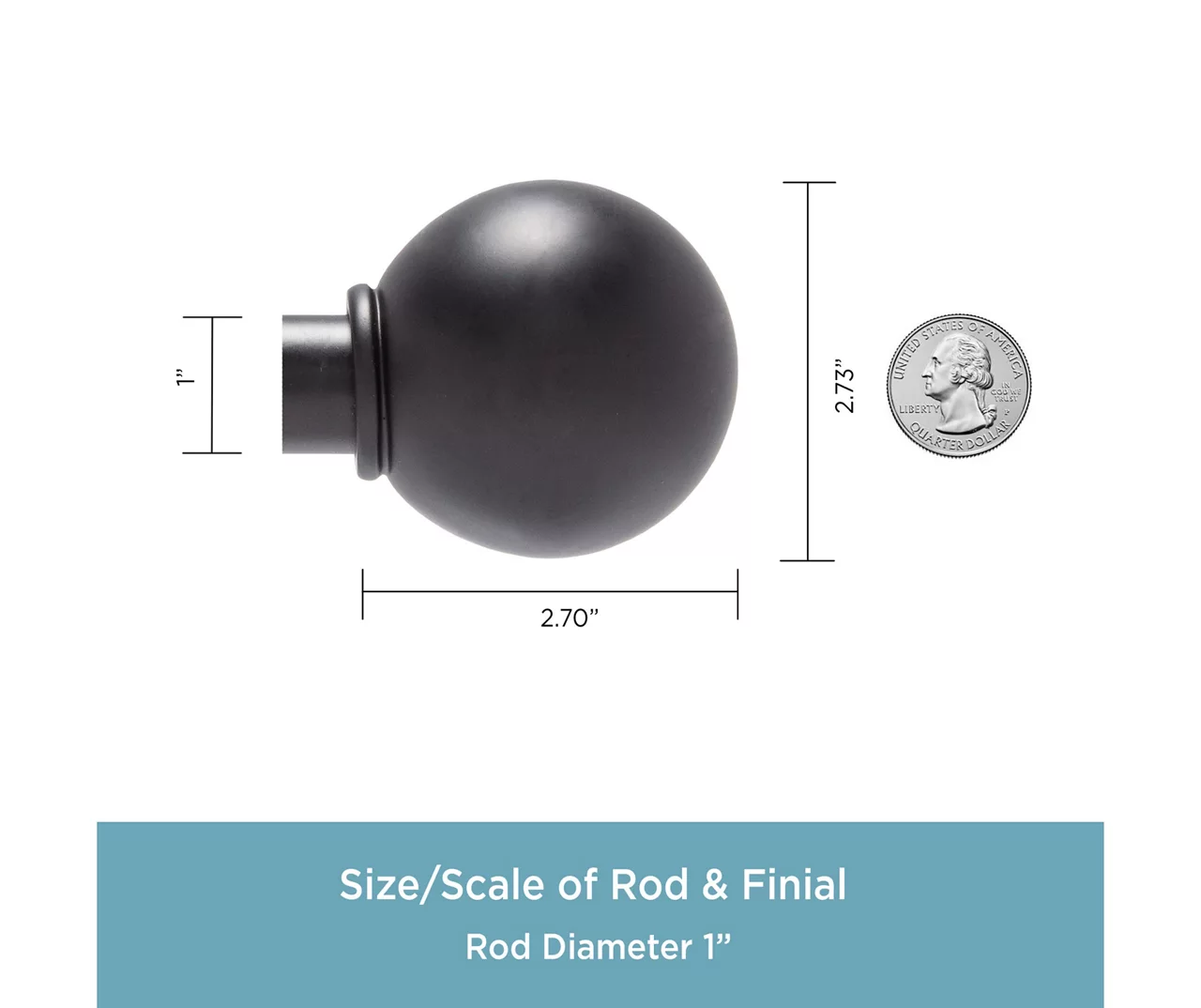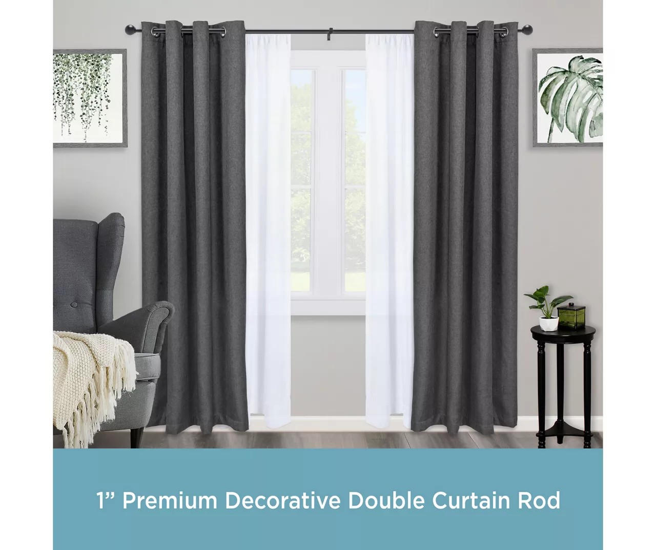 Add a layered look to your home with the Edith decorative double curtain rod by Kenney. The 1-inch diameter Edith double curtain rod in matte black features matching decorative ball shaped finial ends and adjusts 36 inches to 66 inches to fit your window. The front rod projects 5.14 inches while the back rod projects 2.80 inches from the wall. A 1-inch diameter double curtainrod is recommended for use on larger windows in larger rooms, such as your dining room, bedroom or living room, to layer sheers and heavyweight, thermal, or room-darkening curtains. Layering curtains gives you more control over how much light to let into your room throughout the day and provides more insulation during colder months.