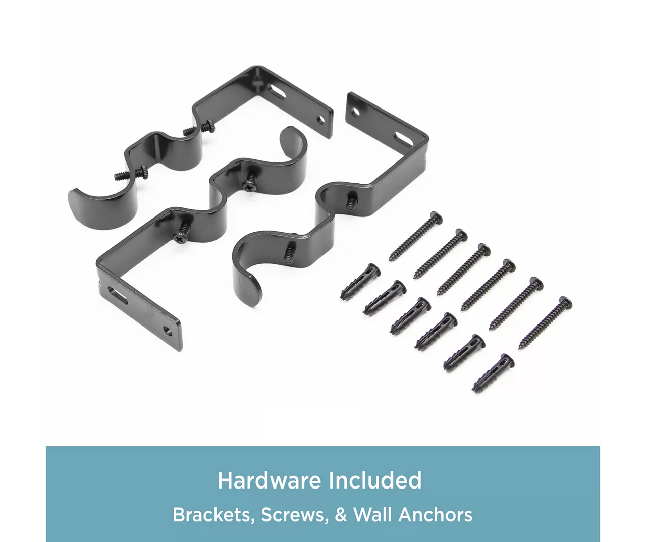 - Includes 1 telescoping double curtain rod with finials, 2 mounting brackets, 1 center support, screws, drywall anchors and installation instructions
