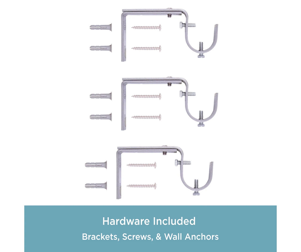 - Includes 1 telescoping curtain rod with finials, 2 brackets, 1 center support, screws, drywall anchors and installation instructions