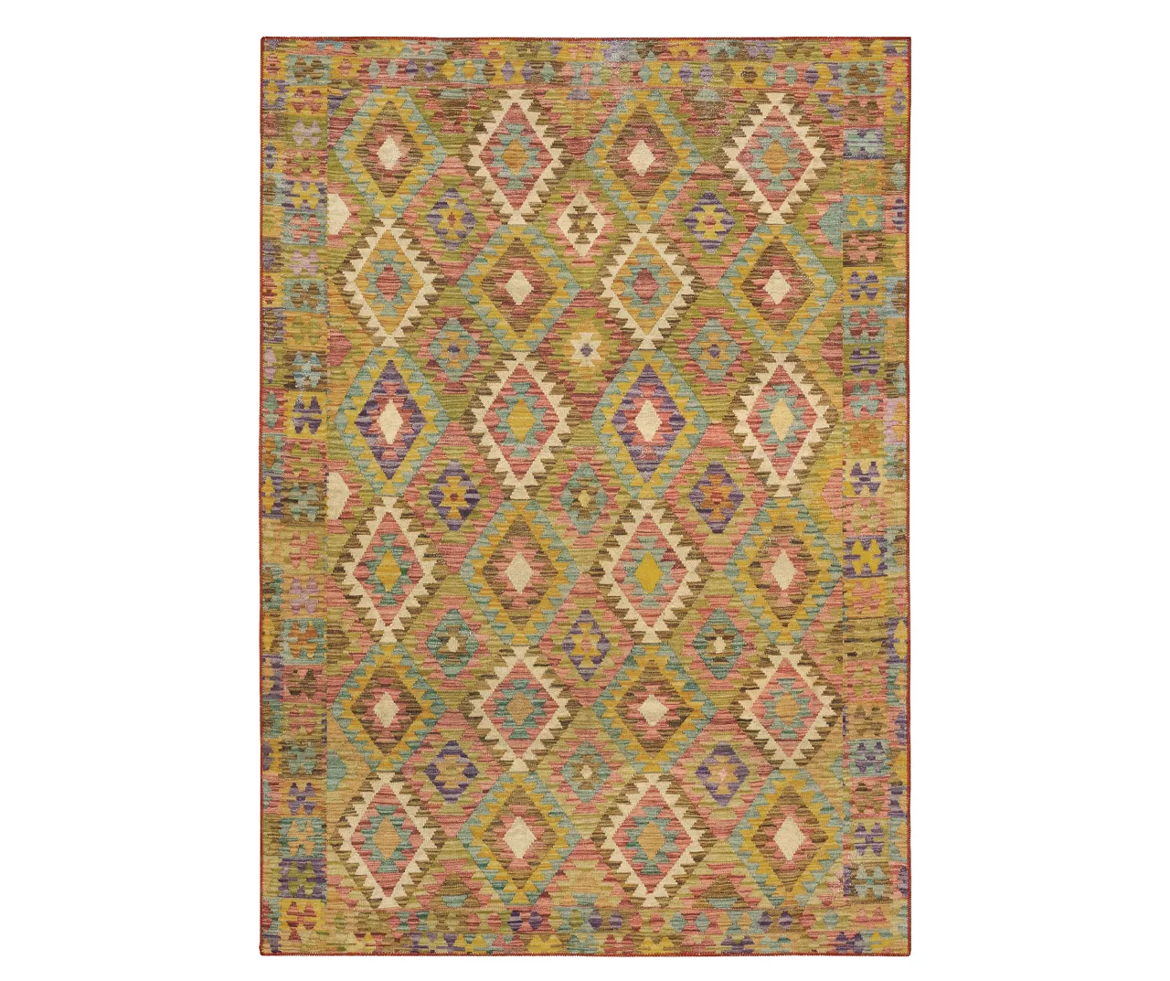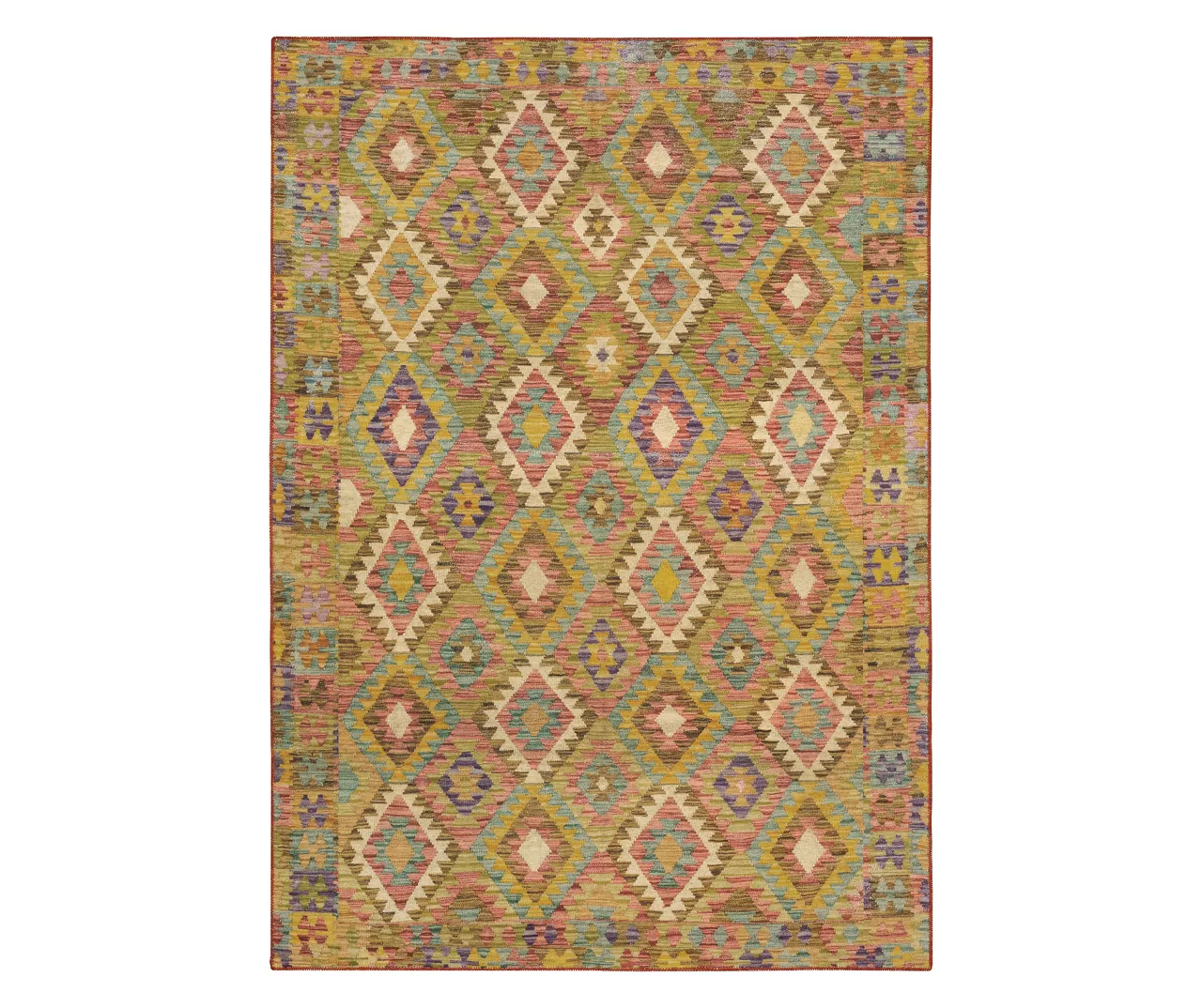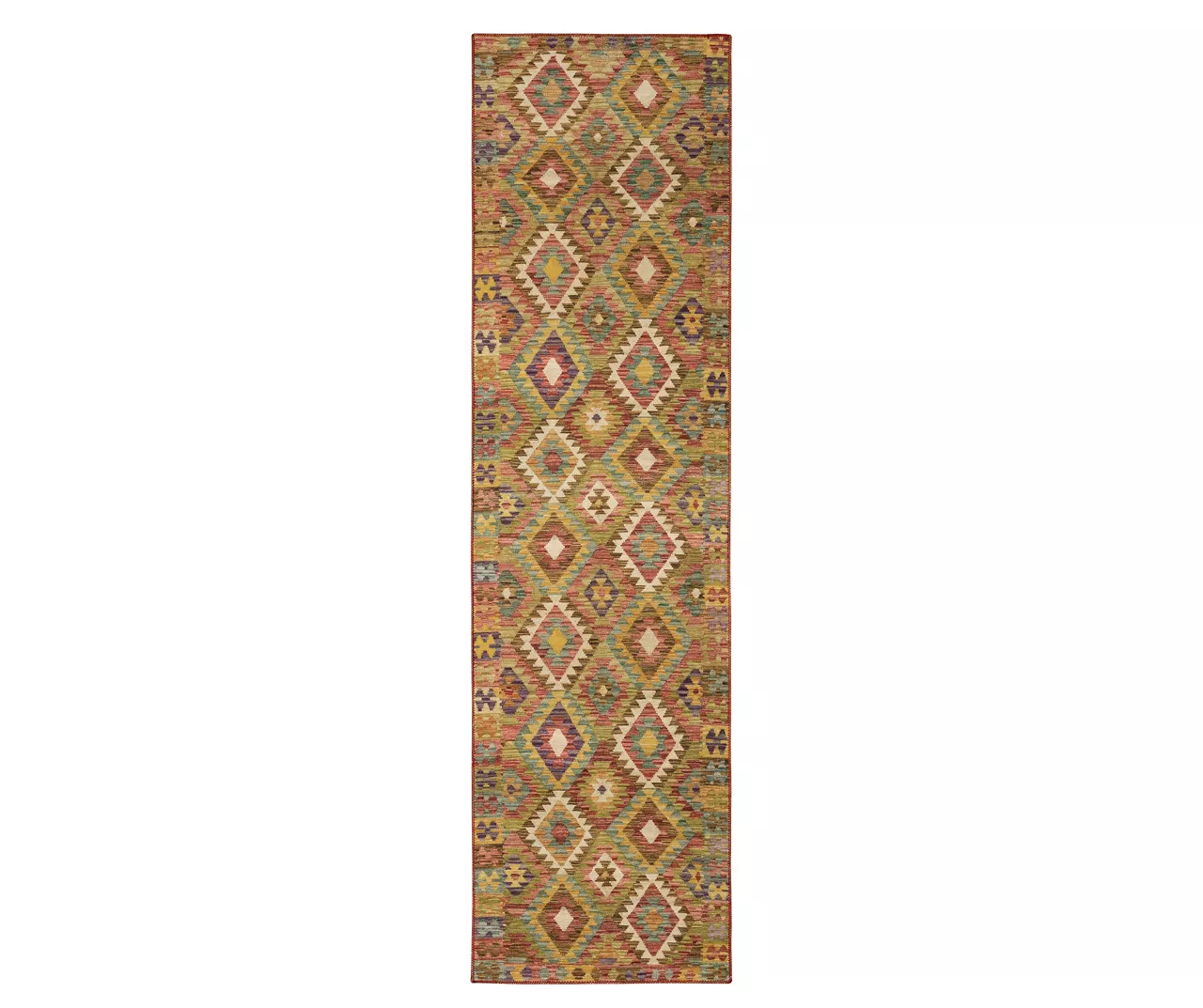 The Maclo collection, machine-made from soft polyester, features an innovative printed base with non-slip backing that is perfect for high-traffic areas and family living spaces. With its low pile and intricate blanket stitch finish, this rug showcases a geometric design inspired by American Southwest style in dark gold, red, teal, green and brown hues that effortlessly complements any room in your home.