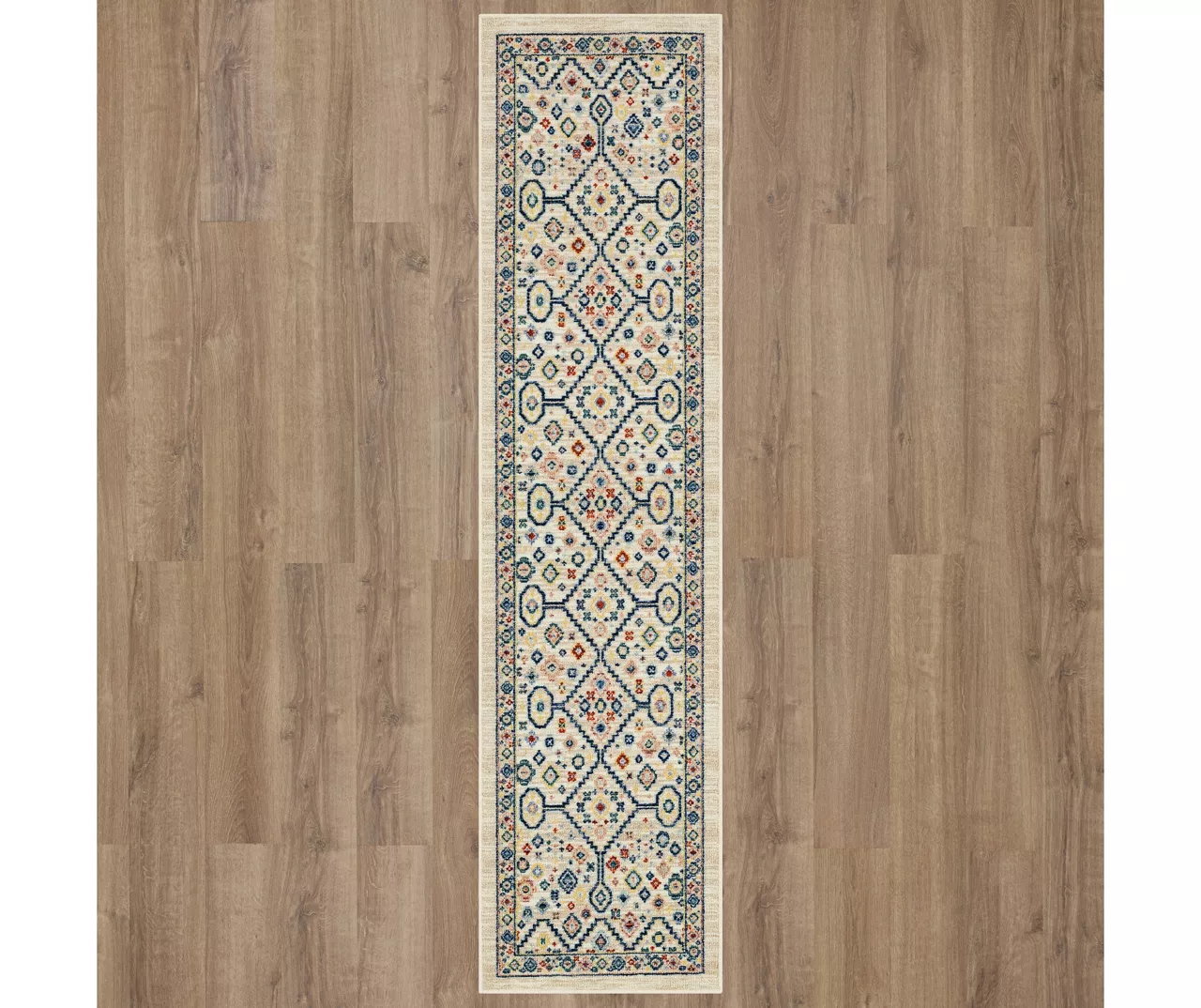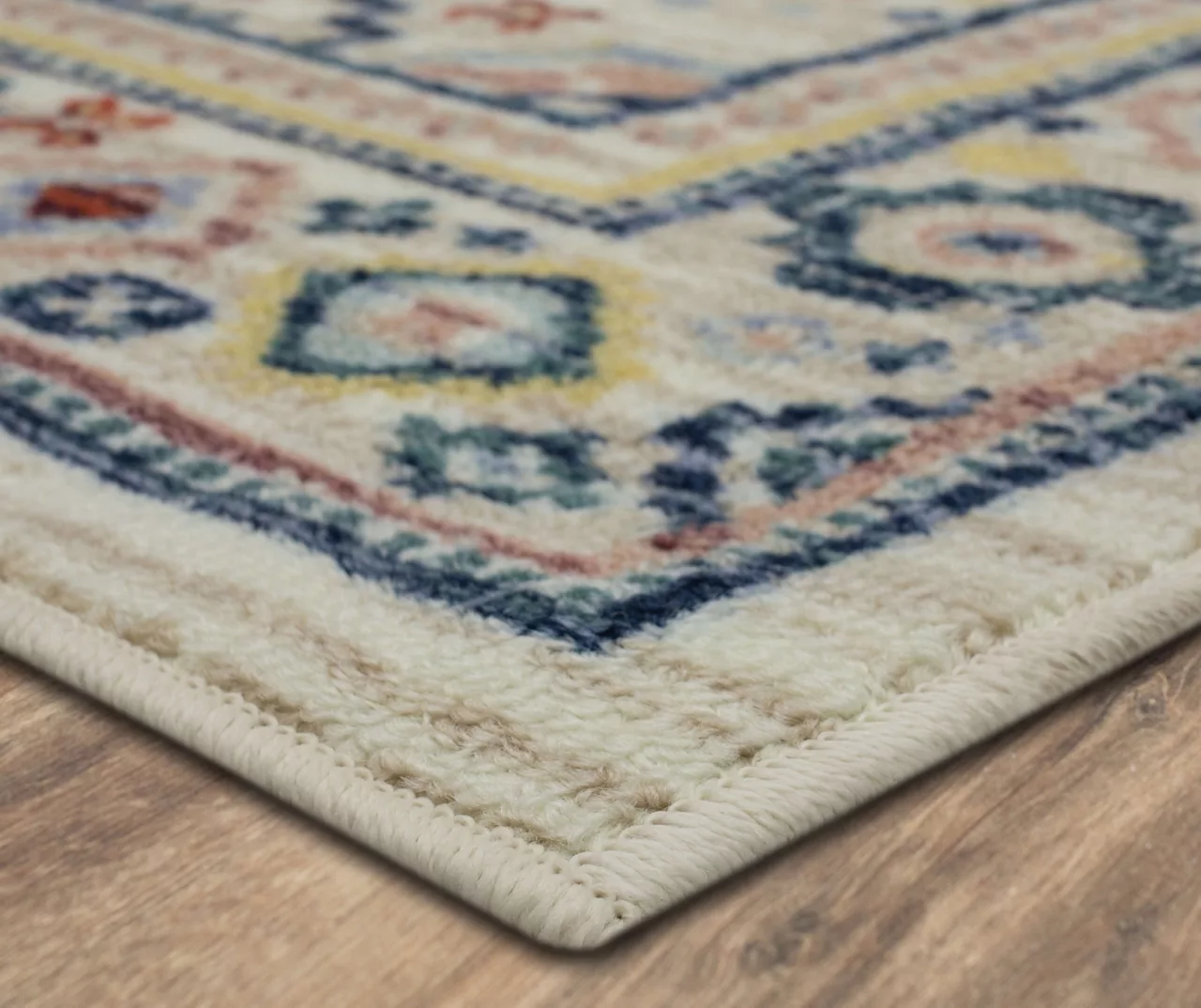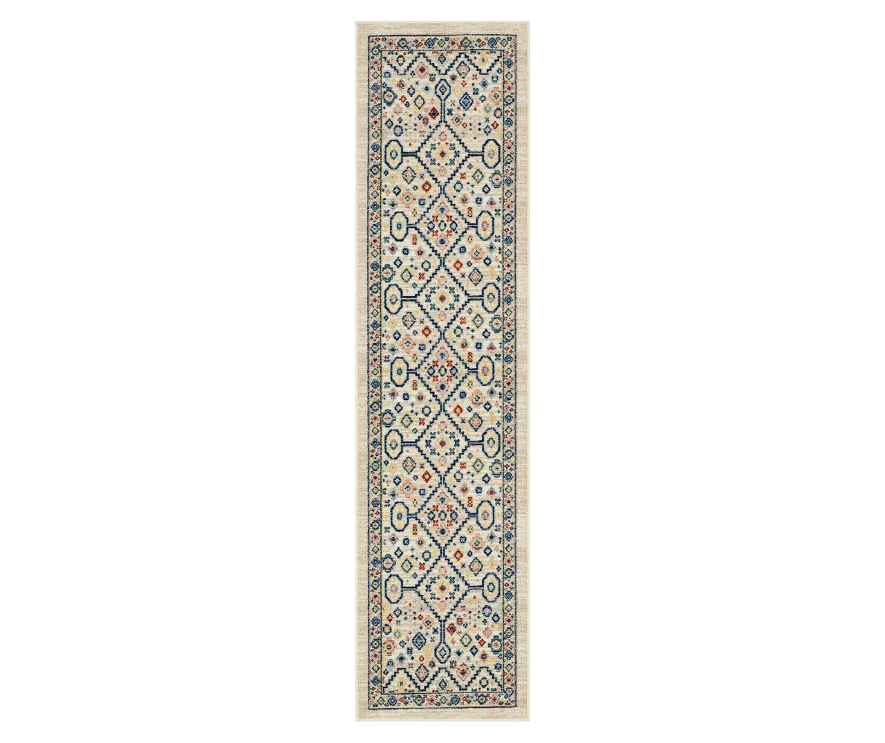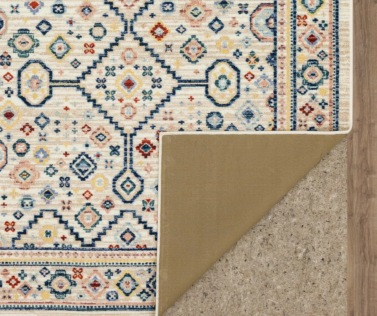 The Mohawk Home Metis area rug features an ornamental geometric motif in a bold multi-color palette on white that is sure to bring a pop of color and traditional flair to any room. The low pile is created with Mohawk’s premium wear-dated nylon fiber for a soft touch and dependable durability. This rug is sure to make an elegant addition to a bedroom or other living space and the non-skid latex backing helps to keep things in place.