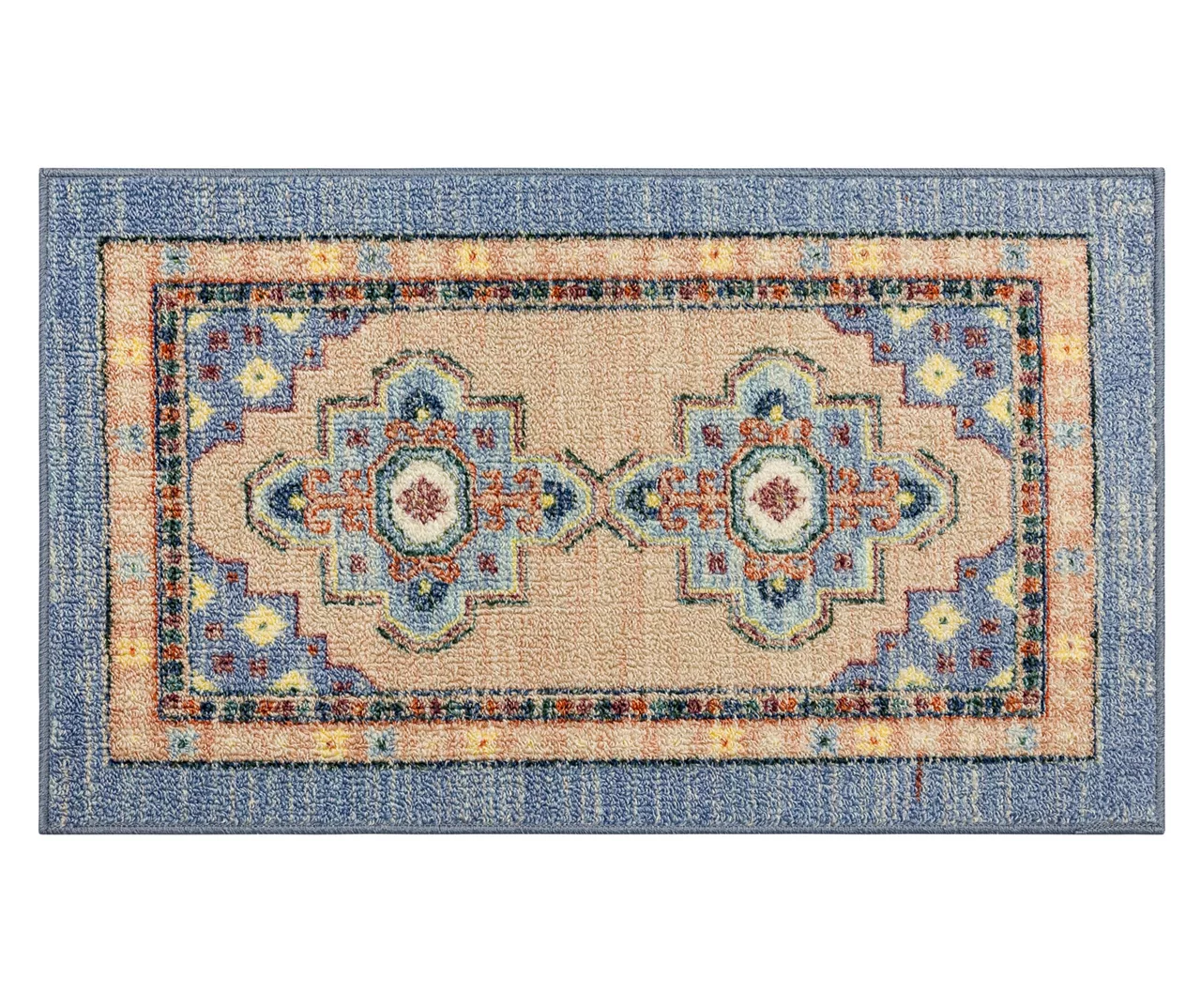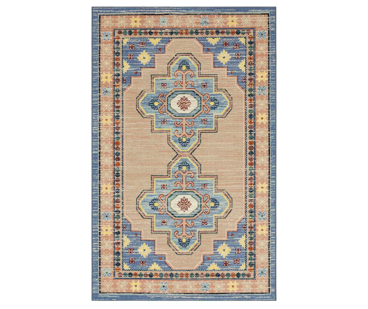 The Mohawk Home Coeus area rug features an ornamental design motif in a soothing peach and blue palette that is sure to bring subtle elegance to any room. The low pile is created with Mohawk’s premium wear-dated nylon fiber for a soft touch and dependable durability. This rug is sure to make an elegant addition to a bedroom or other living space and the non-skid latex backing helps to keep things in place.