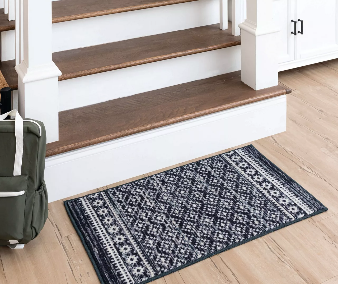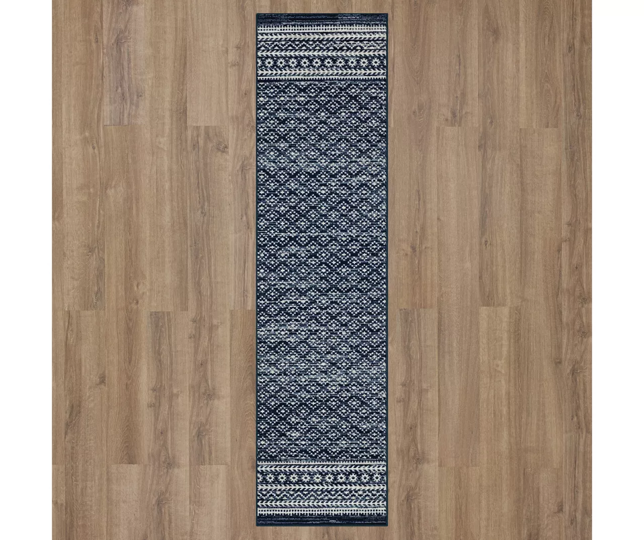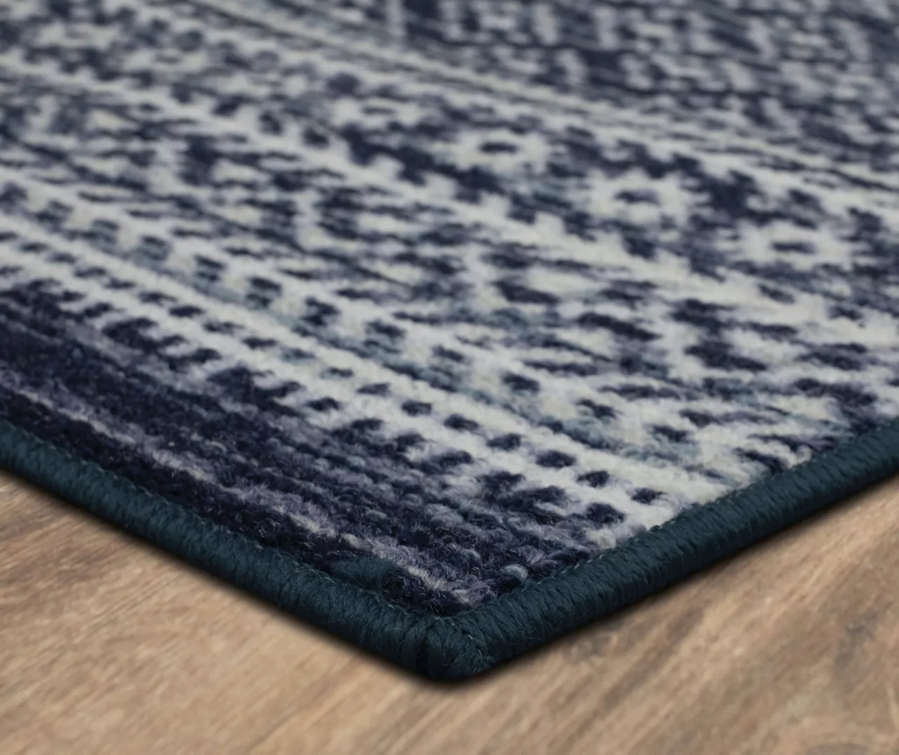 The Mohawk Home Harley Hill area rug features a geometric motif in a rich navy and white color palette that is sure to perfectly accent any room. The low pile is created with Mohawk’s premium wear-dated nylon fiber for a soft touch and dependable durability. This rug is sure to make an elegant addition to a bedroom or other living space and the non-skid latex backing helps to keep things in place.