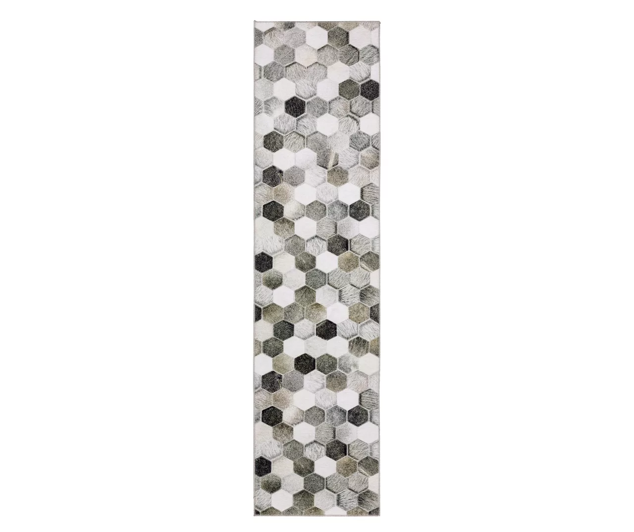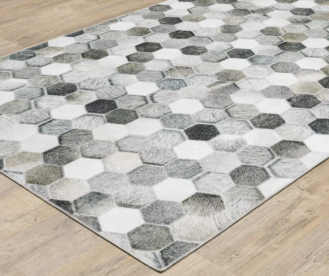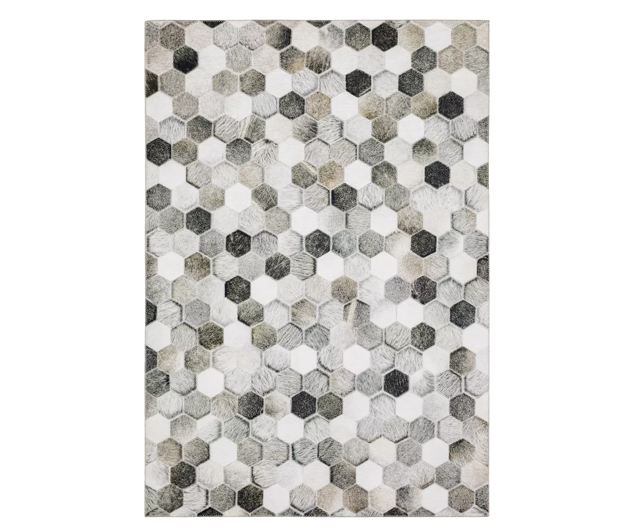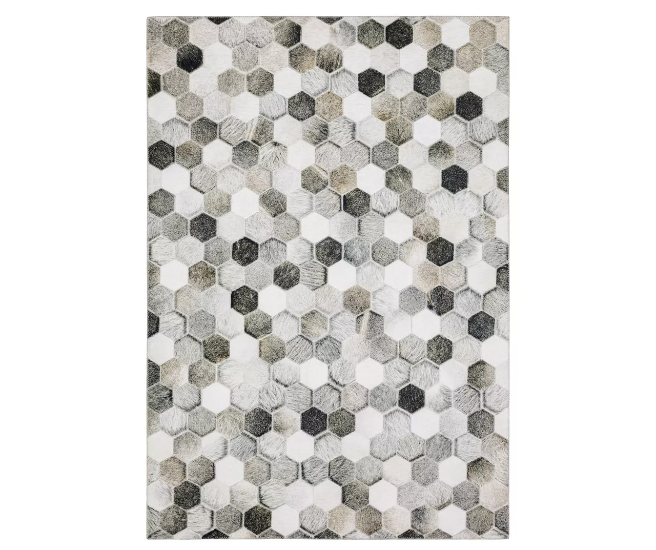 In the Myles collection, technology meets tradition through this hexagon pattern area rug featuring a faux hide texture recreated on a soft stain- and fade-resistant polyester pile. The result is an easy-to-care-for rug that’s low-profile and comfy, with all the appeal of a one-of-a-kind piece in neutral shades of gray and charcoal.