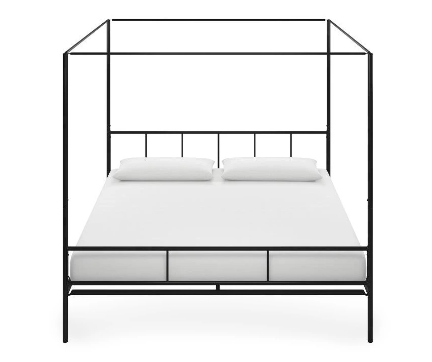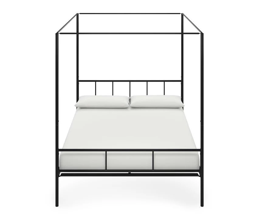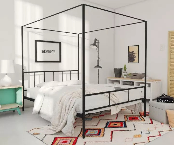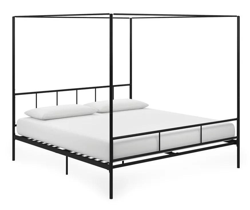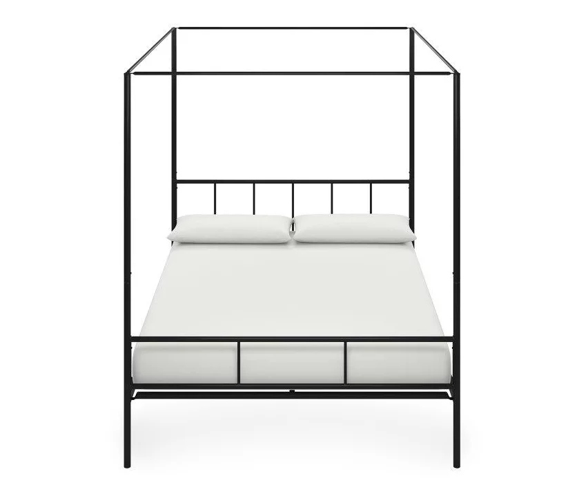 The Novogratz Marion canopy bed is stylish and classy. Designed with a clean silhouette, this eye-catching piece is crafted in solid and sturdy metal that is stable and durable with secure metal slats that do not require a foundation. It comes with a sophisticated headboard and footboard and with metal side rails and center legs to provide full support and comfort to you and your mattress. The Marion is also practical with 11″Â of clearance beneath the bed, ideal to store things away.