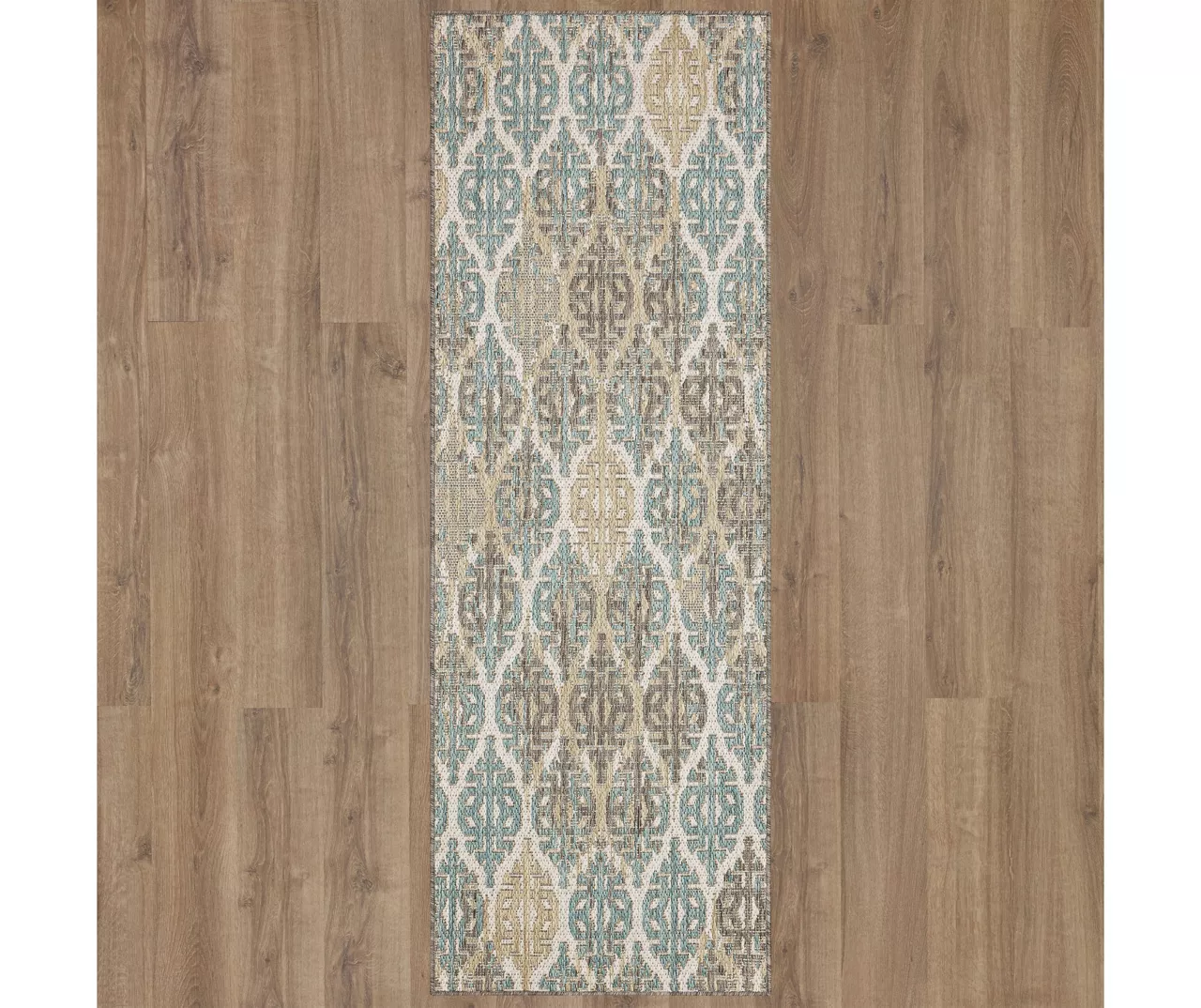 The Mohawk Home Paradise Grove area rug features a scrolling arabesque design in a lovely gray and turquoise palette. Made with all-weather olefin polypropylene yarn, this flatwoven area rug offers a detailed design, soft feel and dependable durability that works in both indoor and outdoor spaces. The resilient surface fibers are resistant to stains, fading and moisture, making it a great choice for high-traffic areas.