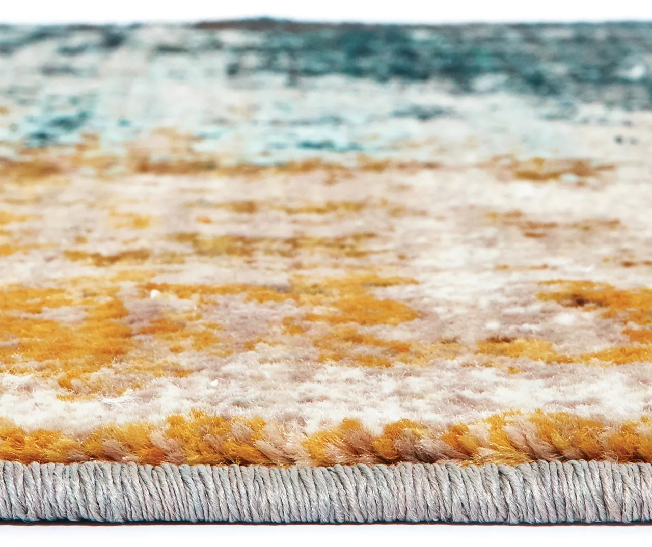 - Colors in this rug include deep midnight teal, saffron gold and bright carnelian red