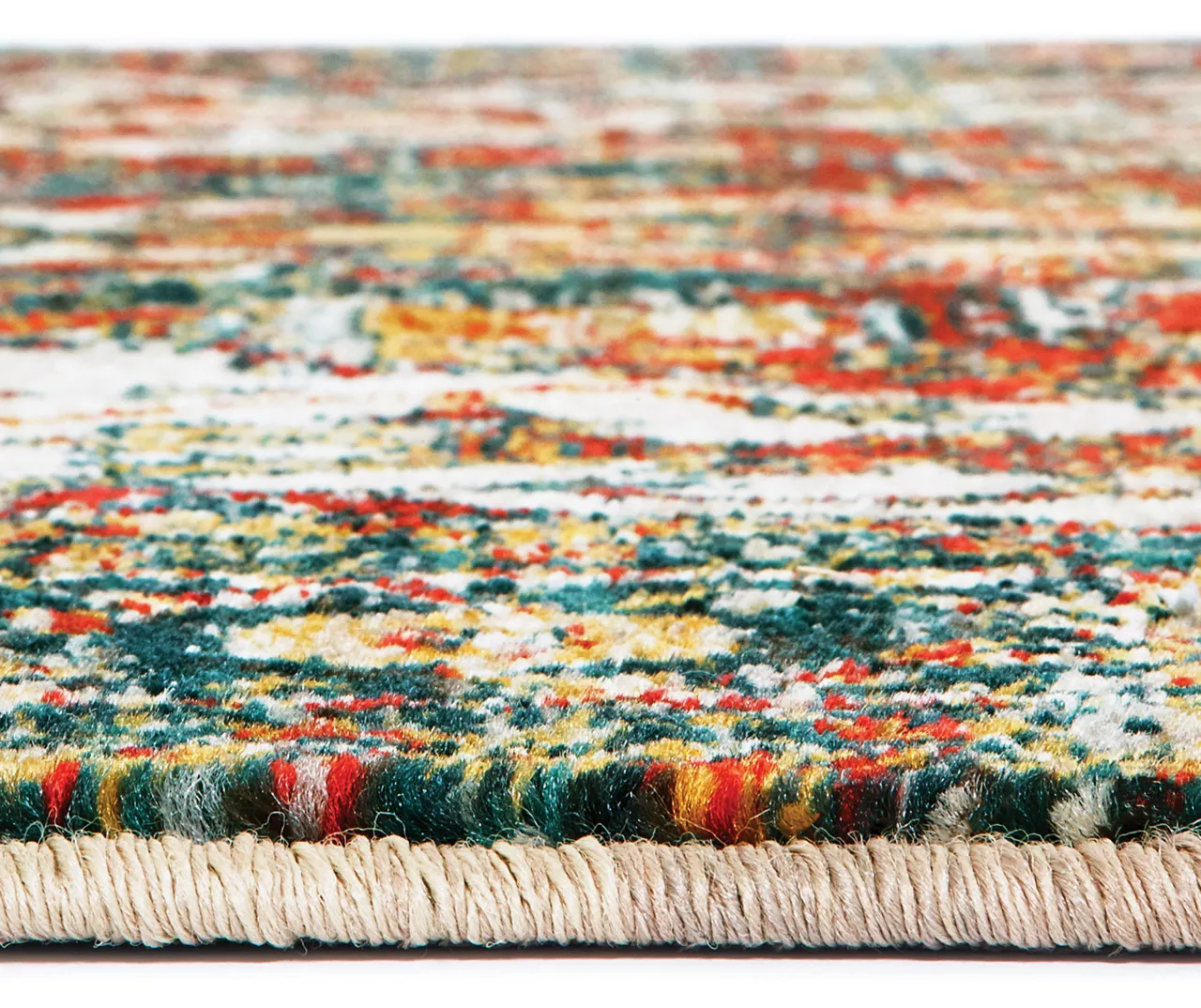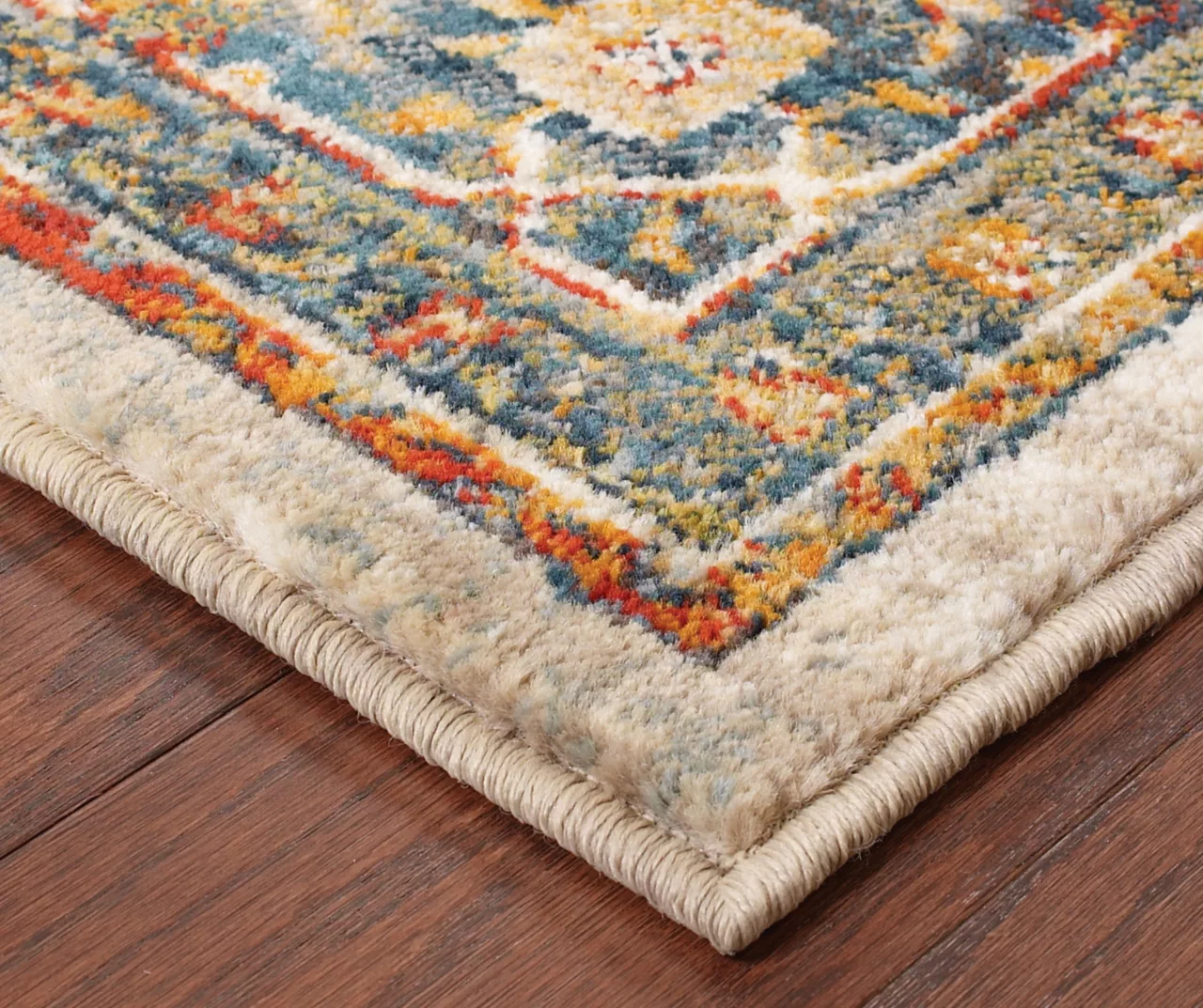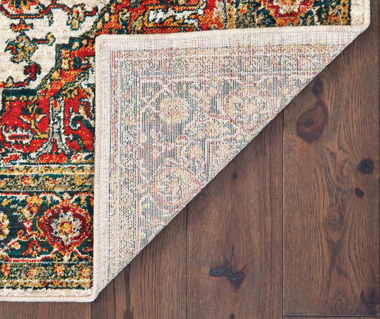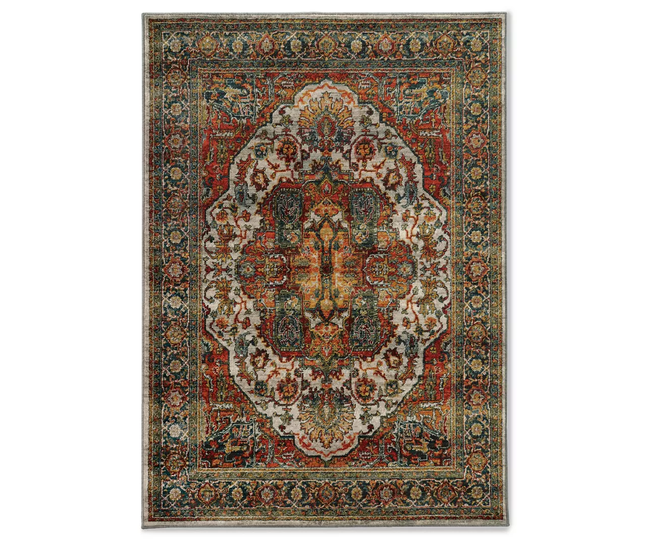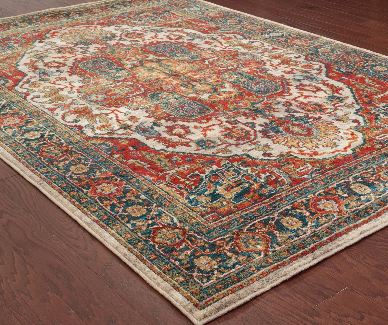 - Colors in this rug include bright carnelian red, cool gray, saffron gold and deep midnight teal