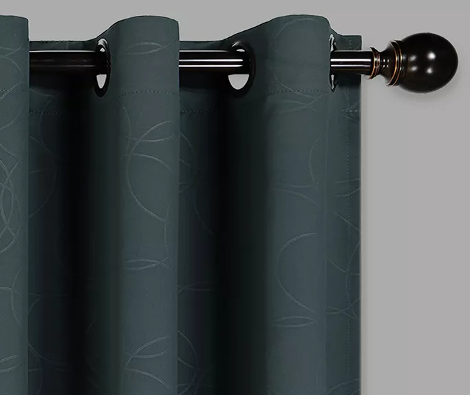 Find the perfect combination of fashion and function with the forest Round and Round blackout window panel from Eclipse. This functional curtain helps provide privacy, manage light, reduce noise and help with energy savings, without sacrificing the latest looks in window fashion. It offers blackout benefits and features a subtle geometric pattern of interlocking circles in green. Blackout yarns are intricately woven into the panel, giving it a rich handfeel and luxurious drapability.