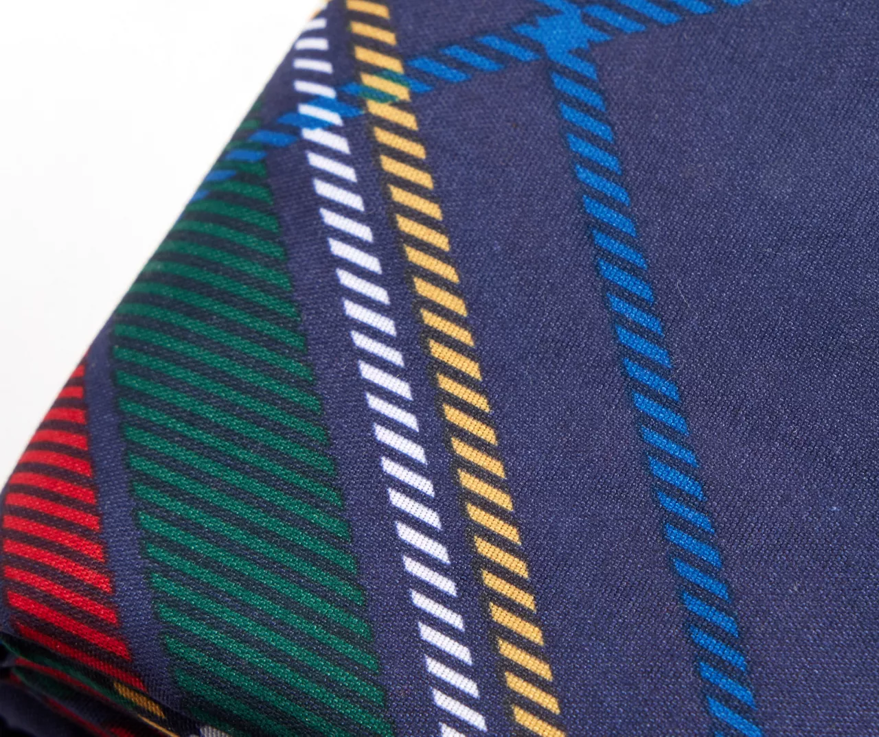 - Allover plaid pattern in navy, red and green