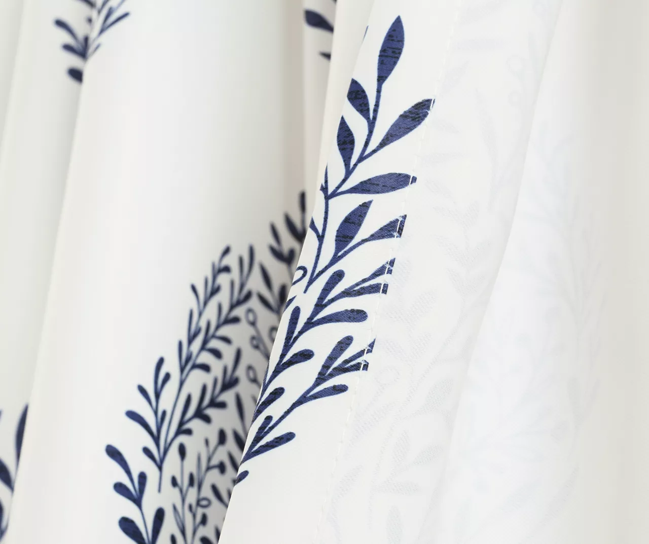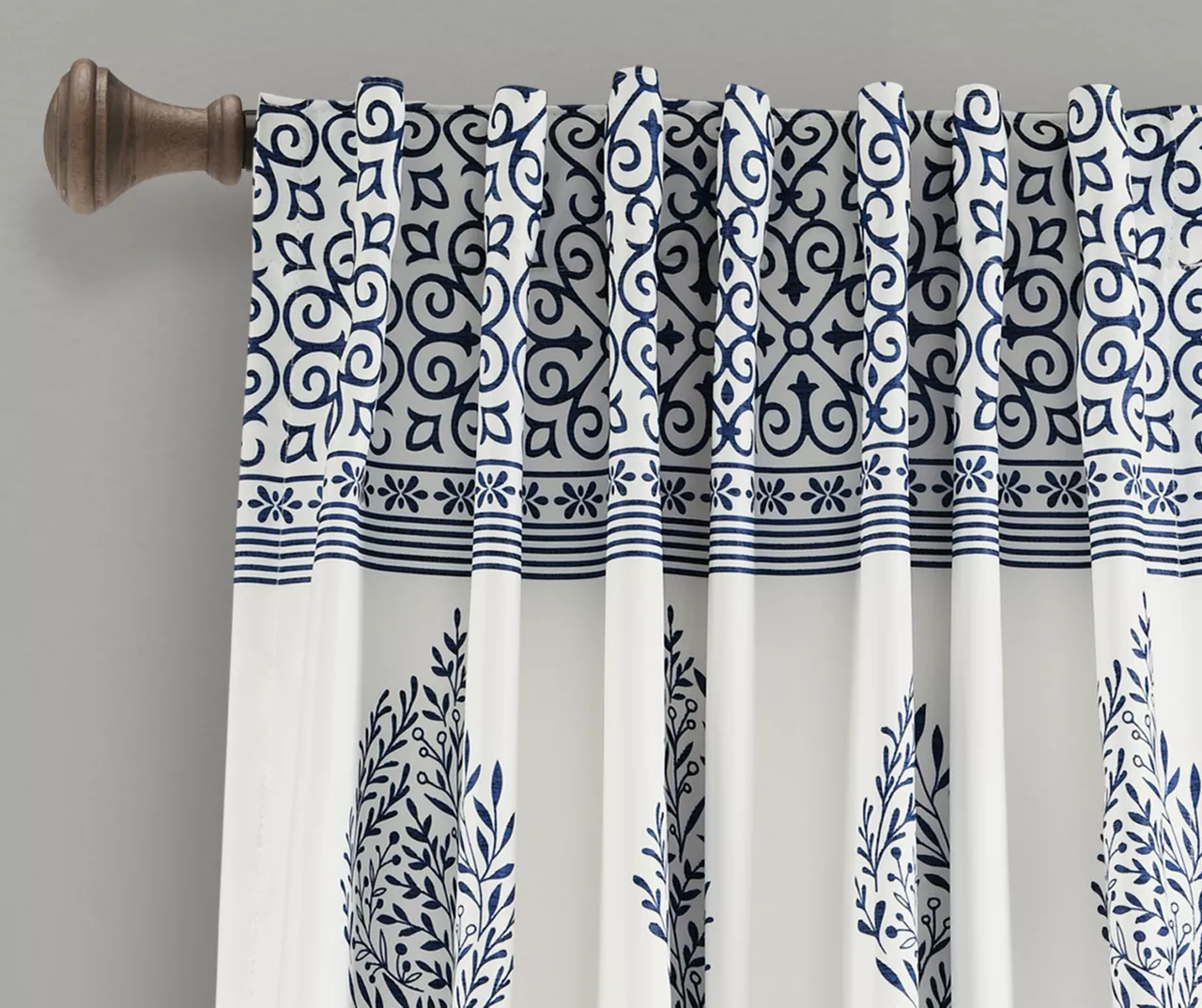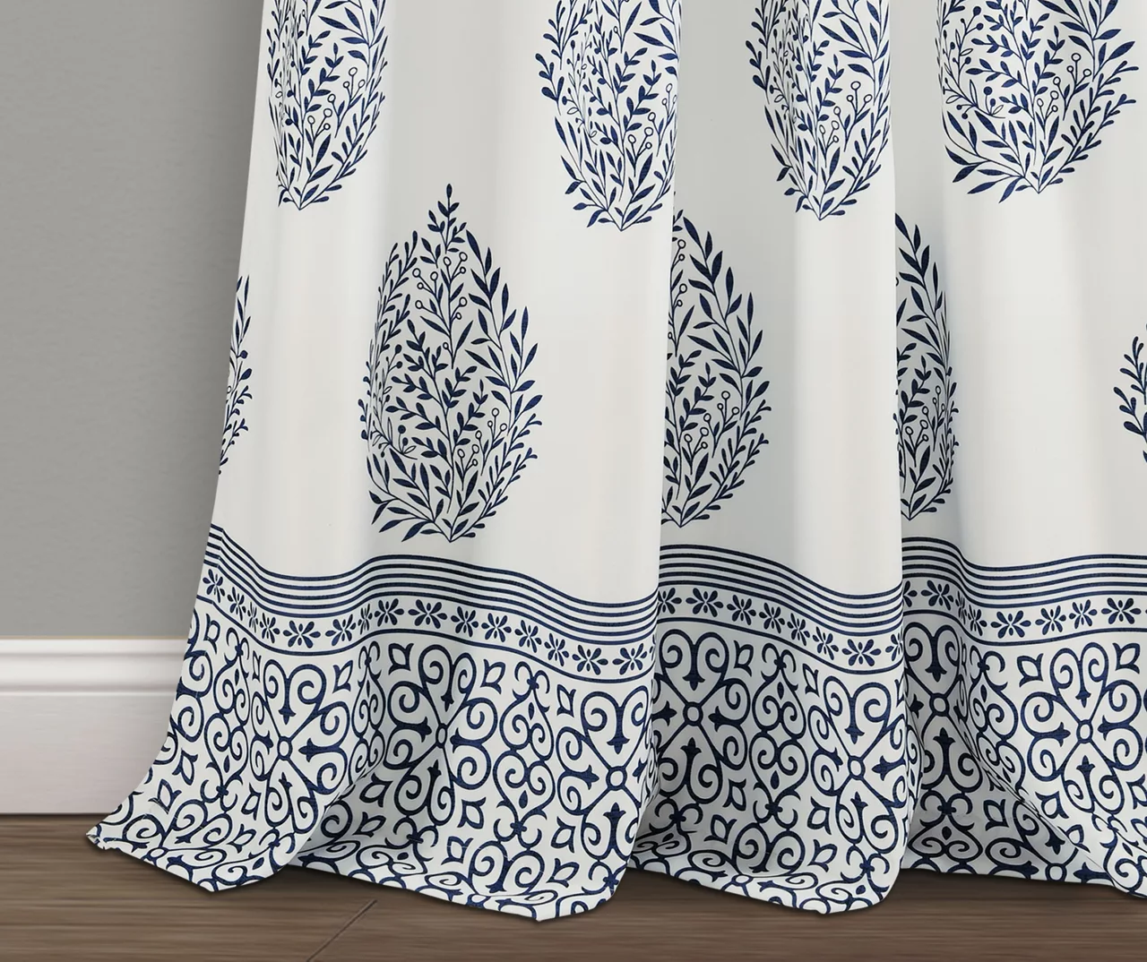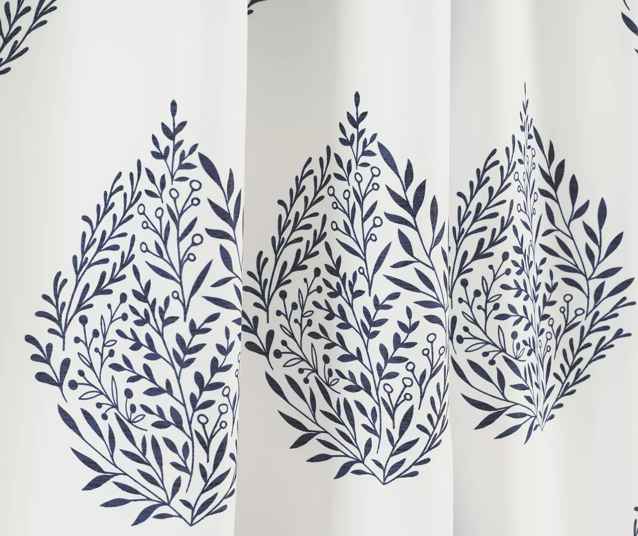 These navy and white nature-inspired curtains exude chic interest thanks to a beautiful pattern of teardrop-shaped leaves between mirrored geometric stripes. In addition to adding style to your space, the room-darkening panels help reduce natural light and enhance privacy. Hang them in the living room, dining room, bedroom or anywhere you could use a finishing touch of color and pattern.