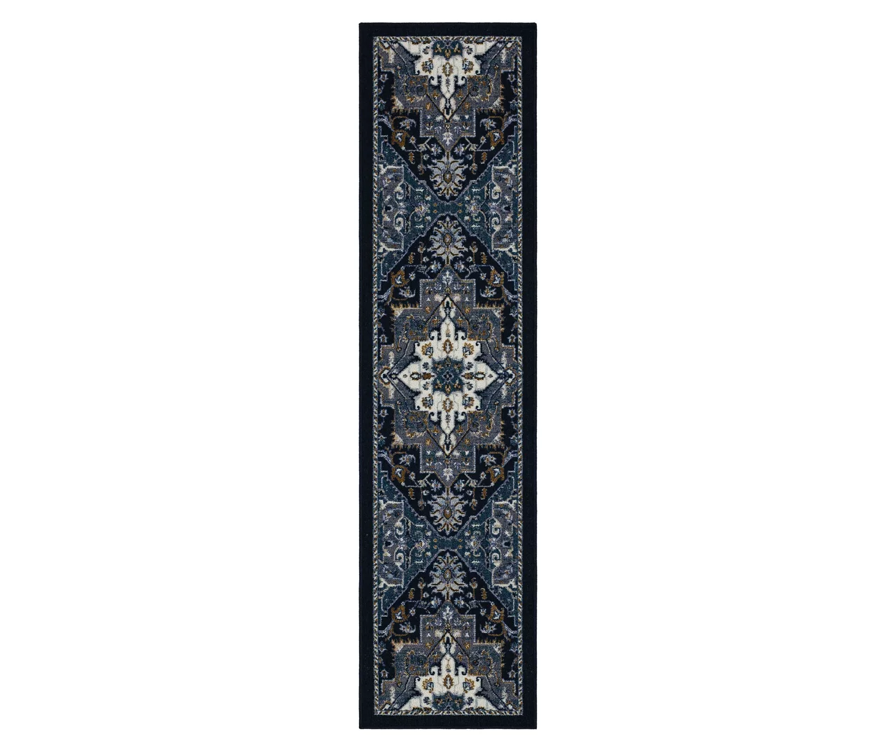 - Ornamental design with geometric elements in shades of navy and charcoal for a traditional look