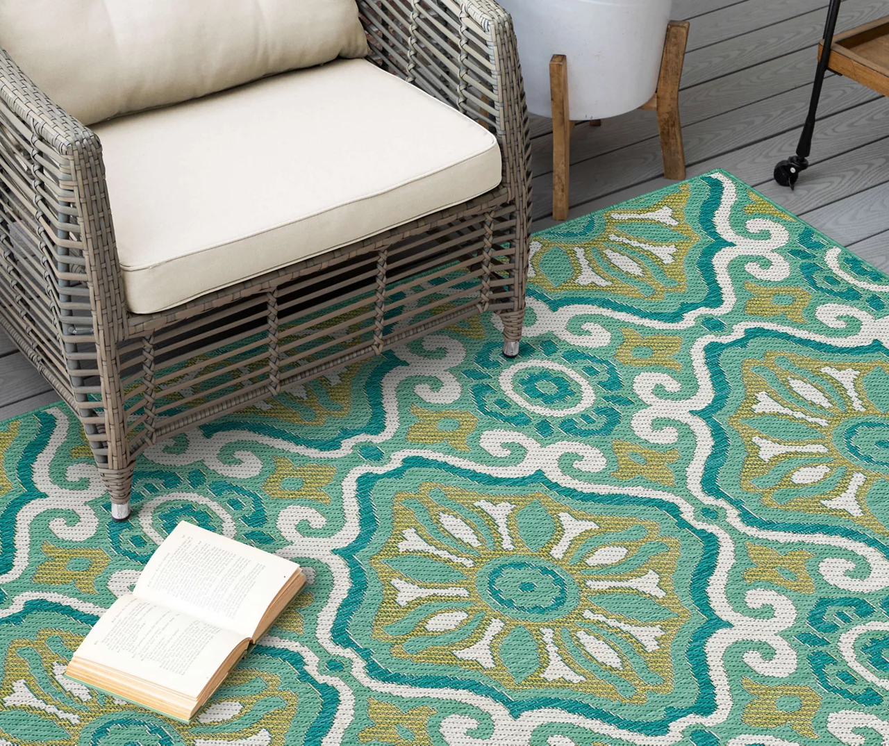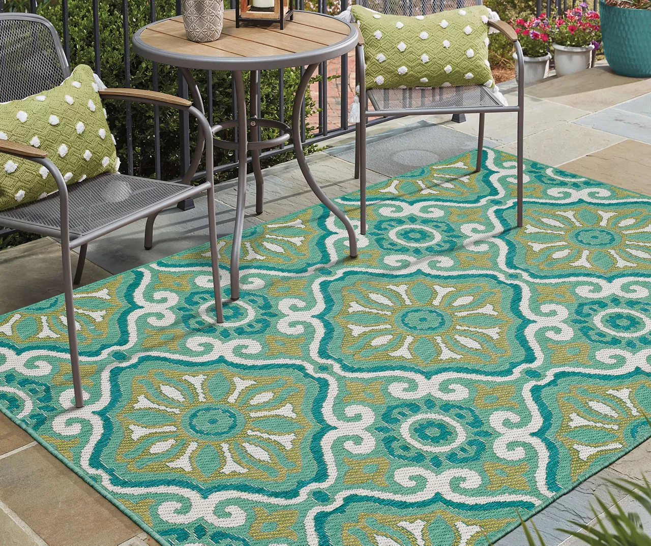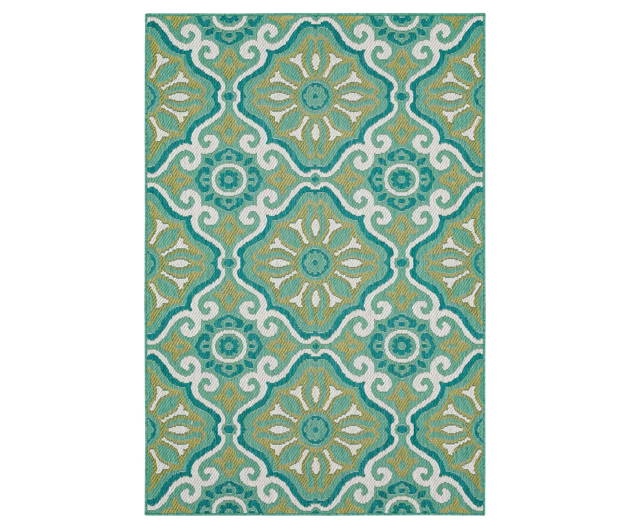 The Mohawk Home Waterside area rug features globally inspired bohemian design in versatile color palette combinations of teal, turquoise and white. Made with all-weather olefin polypropylene yarn, this flatwoven area rug offers a detailed design, soft feel and dependable durability that works in both indoor and outdoor spaces. The resilient surface fibers are resistant to stains, fading and moisture, making it a great choice for high-traffic areas.