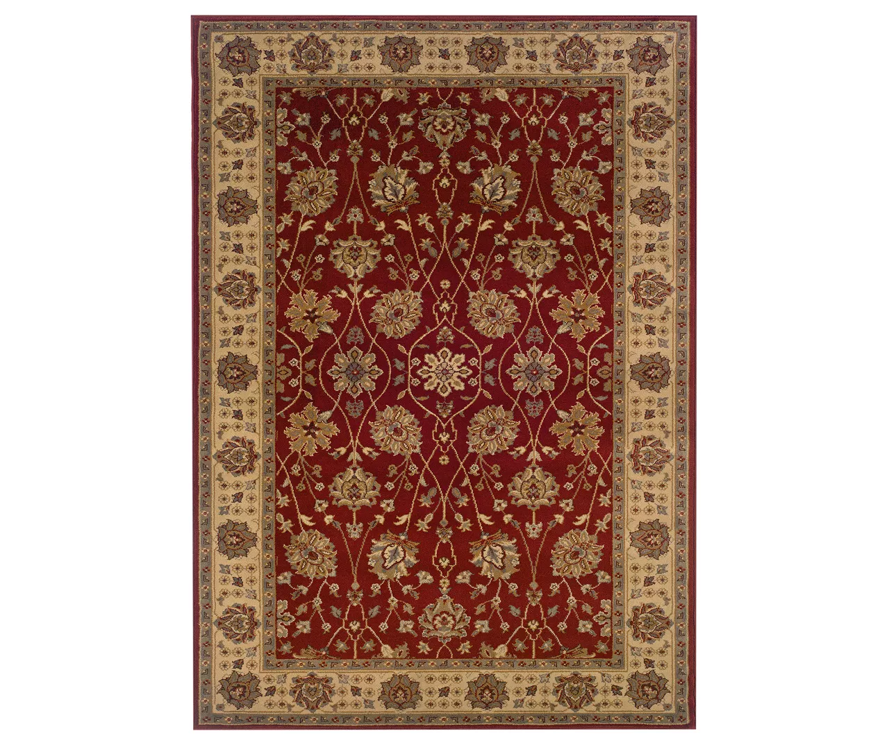 - The colors included in this rug are red, beige, slate, and sage